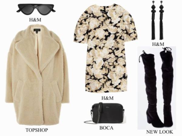 Jeżeli nie lubisz jednolitych stylizacji, warto wybrać ubrania we wzory. Nawet wielkie kwiaty, utrzymane w beżowej tonacji nie będą krzykliwe. Do beżu doskonale pasuje też czerń. Buty za kolano i okulary przeciwsłoneczne o ciekawym kształcie będą dodawały tej stylizacji zadziorności.