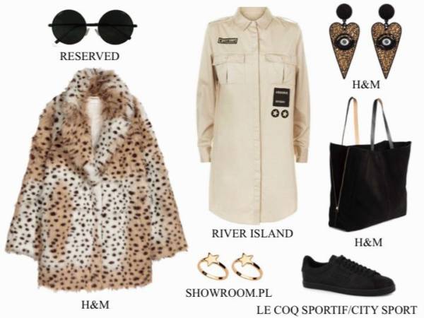 Beż nie wyklucza szaleństw! Do koszulowej sukienki z nadrukami dobierz oryginalną biżuterię, okrągłe okulary i płaszcz imitujący futro dzikiego zwierzęcia lub owczą wełnę, a będziesz wyglądać jak prawdziwa gwiazda.