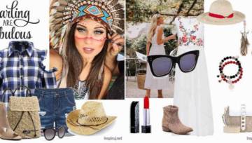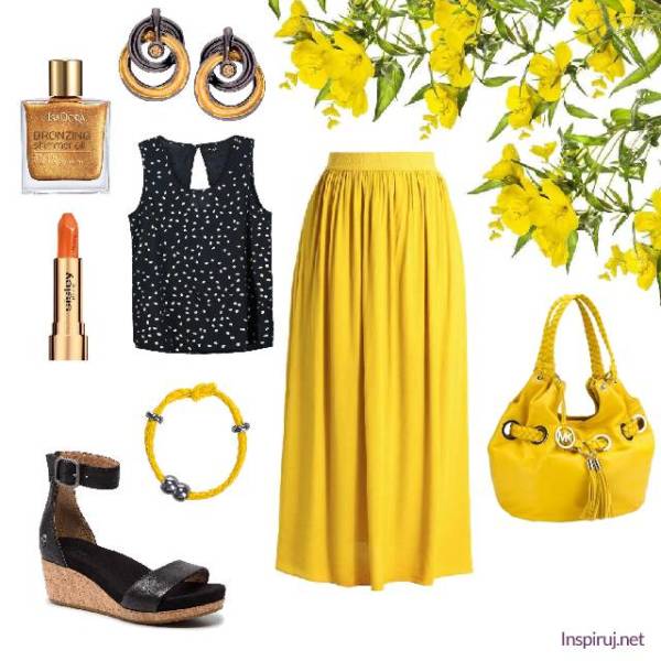 Pierwszy zestaw, który chcemy Wam polecić składa się z czarnej bluzki bez rękawów i modnej maxi spódnicy z luźnego materiału w kolorze południowego słońca. Dodatki to pojemna torebka i sznurkowa bransoletka (obie również w ciepłym kolorze żółci), czarne sandałki na korkowej koturnie, zapinane nad kostką i ciekawe kolczyki z dwoma zachodzącymi na siebie obręczami. Nasza Inspirantka nie zapomniała też o nabłyszczającym balsamie do ciała i oranżowej pomadce. Aż ma się ochotę „iść, ciągle iść w stronę słońca”!