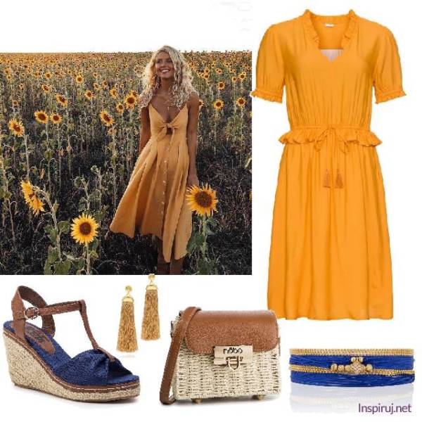 Drugi zestaw jest utrzymany w odcieniu zachodzącego słońca i ozdobiony plecionymi oraz niebieskimi elementami. Na pierwszy plan wysuwa się tu luźna sukienka z romantycznymi, krótkimi falbankami na rękawach, kołnierzu i w pasie. Uroku dodają jej wiszące kolczyki ze złotymi chwościkami i mała torebka-koszyk. Rolę kontrastowych akcentów pełnią zaś sandałki na naturalnej koturnie oraz niebieska bransoletka z jedwabnych sznureczków, cyrkonii i srebra. Stylizacja doskonała na romantyczny spacer albo wieczorne spotkanie nad brzegiem morza!