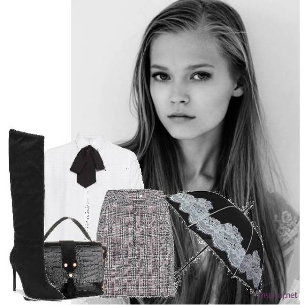 Drugi outfit został zbudowany wokół kontrastu czerni i bieli, który sprawdza się w każdej sytuacji. Białą koszulę z krawatką zestawiono tu z kraciastą spódnicą, bardzo w stylu vintage, oraz kozakami i klasyczną czarną torebką. Kropkę nad „i” stanowi zabawna parasolka z wyrazistym wzorem, obok której trudno przejść obojętnie.