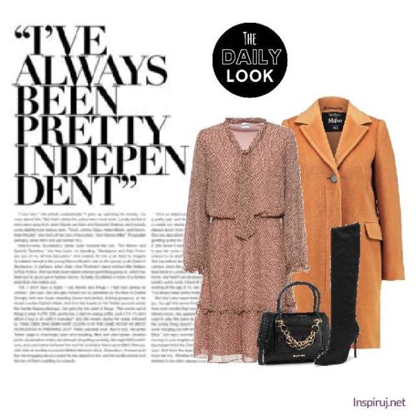 Pierwszy zestaw bazuje na oryginalnej, bladoróżowej sukience z krawatką i wiązaniem, którą połączono z czarnymi kozakami na szpilce i pasującą do nich torebką, ozdobioną łańcuchem. Całość wieńczy miękki płaszcz w modnym i zarazem odważnym, pomarańczowym odcieniu, dowodzący, że nosząca go osoba jest pełna poczucia humoru i dystansu do świata.