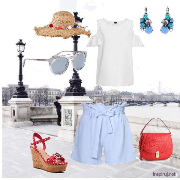 Druga stylizacja będzie idealna na najgorętsze godziny dnia. Łączy w sobie krótkie, bladobłękitne szorty, białą bluzkę z fantazyjnie wyciętymi rękawami typu motylek, sandałki na koturnie i wakacyjny kapelusz z plecionki ozdobiony kolorowymi pomponikami. Zestaw świetnie uzupełniają niebieskie kolczyki, przeciwsłoneczne okulary o jasnej tonacji i niewielka czerwona torebka. Nie sposób nie zwrócić na niego uwagi podczas spaceru!