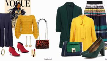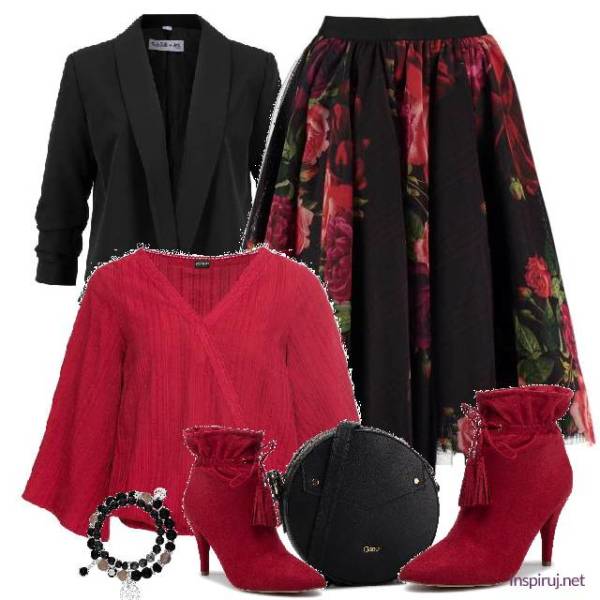 Drugi outfit ma bardziej marzycielski charakter. Jej bazą jest rozkloszowana spódnica z szerokimi plisami i delikatnym kwiatowym nadrukiem rozmywającym się na czarnym tle. W tym przypadku modny odcień Biking Red akcentuje zwiewna bluzka oraz zabawne botki z wiązaniami zakończonymi chwościkami. Całości dopełnia grafitowa marynarka, ciemna bransoletka z kuleczkami i nieco szalona, okrągła torebka w stylu artystki.