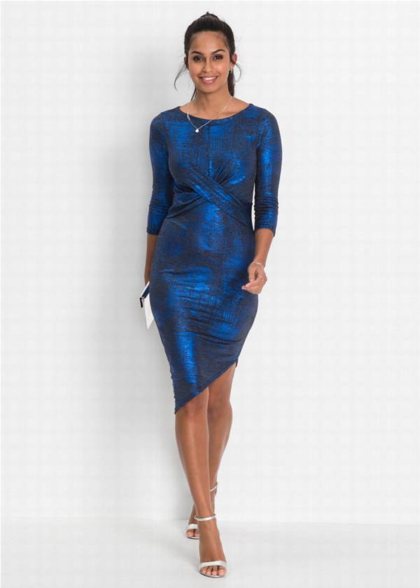 Niebieska sukienka z metalicznym połyskiem i asymetrycznym dołem – bonprix, 109,99 zł
