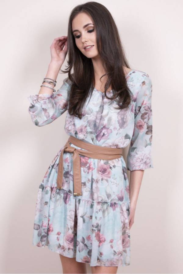Luźna błękitna sukienka w kwiaty, z rękawem 2/3 – Jesteś modna, 149 zł