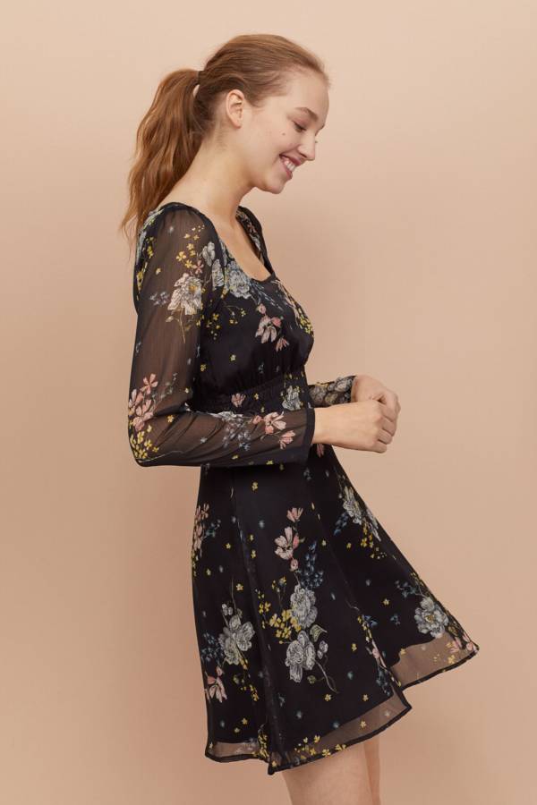 Słodka sukienka w kwiaty z delikatnymi prześwitami – H&M, 79,99 zł