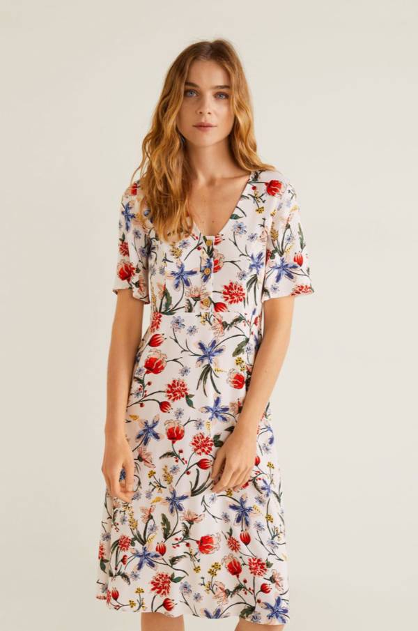 Biała sukienka w gęsty print z kolorowymi kwiatami – Mango, 159,90 zł