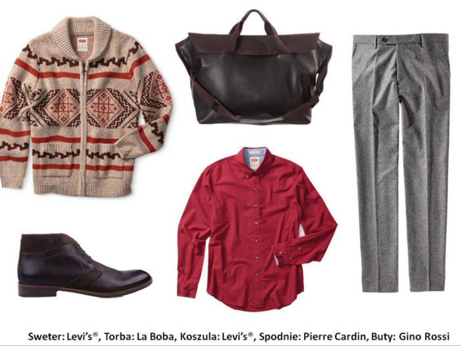 Jeżeli lubisz bawić się modą, sięgnij po stylizację w stylu vintage. Materiałowe męskie spodnie nawiązujace krojem do lat 60. będą wyglądać oryginalnie w zestawieniu z jasnym swetrem w nordyckie wzory. Duża, skórzana torba podkreśli nonszalancki charakter całości, a w dodatku pomieści wszystkie świąteczne prezenty.