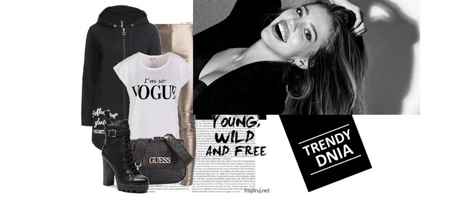 Pierwszy outfit bazuje na żartobliwym T-shircie z hasłem „Jestem tak bardzo Vogue”, do którego Inspirantka dodała odważne złote spodnie, oryginalną czarną bluzę od bonprix z niewielkim napisem na wysokości biodra, ekstrawaganckie sznurowane botki na wysokim słupku i niewielką torebkę marki Guess, uwielbianej przez fashionistki.