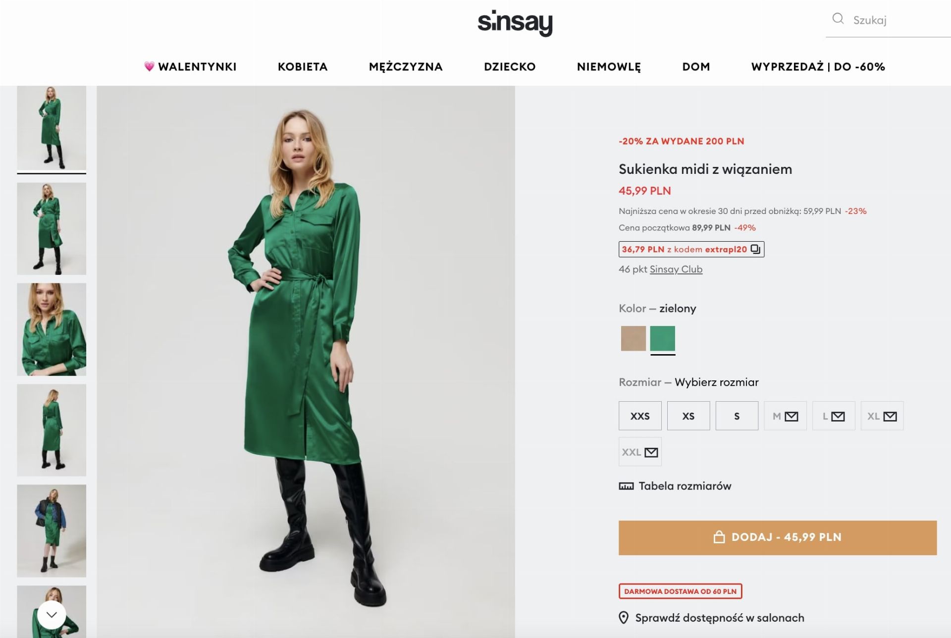 Sinsay regularnie rusza z wielkimi wyprzedażami. Tak jest również w przypadku modnej sukienki dla 50-latki, którą teraz dostaniemy już za… 36,79 zł! Wystarczy wpisać kod – zniżka obowiązuje przy zakupach za min. 200 zł. Propozycja z Sinsay, która doskonale sprawdzi się u kobiet dojrzałych wykonana została z materiału imitującego wyglądem satynę. Ma klasyczny kołnierzyk i zapięcie na guziki – zupełnie tak, jak tradycyjne koszule. Wiązanie na wysokości pasa podkreśla talię i optycznie wyszczupla sylwetkę. Bardzo komfortowy krój, w którym niemal każda z nas wygląda korzystnie.