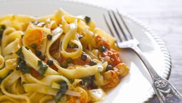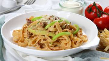 Oto przepis na danie z makaronem w formie płaskich wstążek – czyli tagliatelle. Możesz jednak zastąpić je świderkami – czyli fusilli, skośnymi cienkimi rurkami – penne, a nawet długimi cienkimi sznurkami – czyli znanym spaghetti.