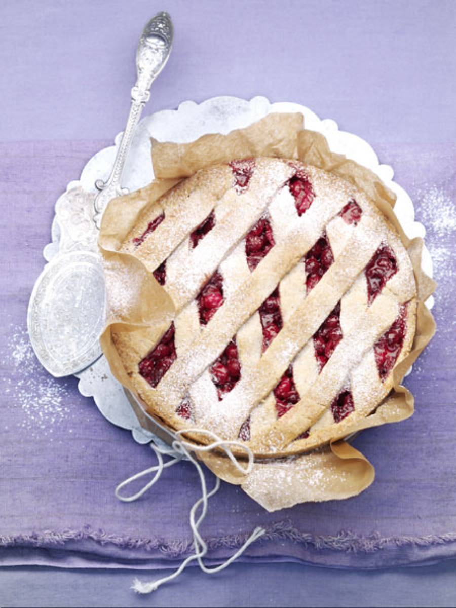 - Po wyjęciu dziurawimy ciasto kilkakrotnie widelcem, nakładamy nadzienie. Odsączamy cranberry i rozprowadzamy na cieście. Pozostałe ciasto rozwałkowujemy i kroimy w paski o szerokości 1,5 cm, zawijając lekko krawędzie. Układamy na żurawinowym nadzieniu w kształcie kratownicy, przyciskając końce do boku formy. Pieczemy w rozgrzanym do 180-200 °C piekarniku około 30 minut (piekarnik gazowy: poziom 2-3/ termoobieg: 160-180 °C).Wyjmujemy, pozostawiamy do ostygnięcia i posypujemy cukrem pudrem.