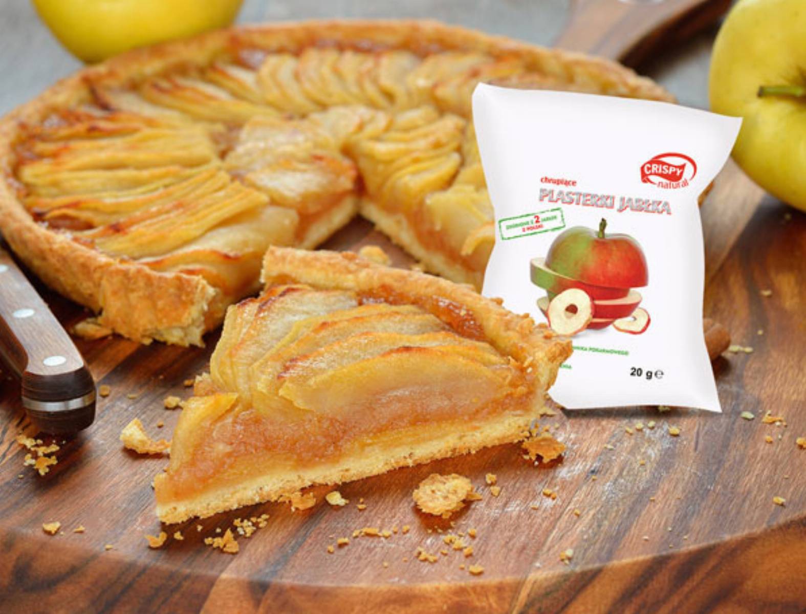 - Po wyjęciu z piekarnika, przed podaniem, ciasto posypujemy brązowym cukrem do smaku oraz Crispy Natural Chrupiące Plasterki Jabłka, by uzyskać efekt delikatności i chrupkości zarazem.
