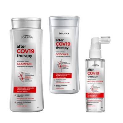 Terapia do włosów wypadających po przejściu Covid-19 Joanna to kompleksowa linia, która wzmacnia, odżywia włosy i stymuluje ich wzrost na każdym etapie pielęgnacji. Szampon, odżywka oraz wcierka zawierają ekstrakty z czarnej rzepy, skrzypu polnego, oraz pokrzywy zwyczajnej, które należą do najskuteczniejszych naturalnych substancji wzmacniających i stymulujących wzrost włosów. Ich działanie wspiera kompleks Vital Hair, który ogranicza wypadanie włosów, wpływa na zwiększenie ich objętości i przywraca im zdrowy wygląd. Witamina PP uelastycznia włosy i nadaje im piękny połysk, a alantoina oraz pantenol nawilżają i koją skórę głowy.