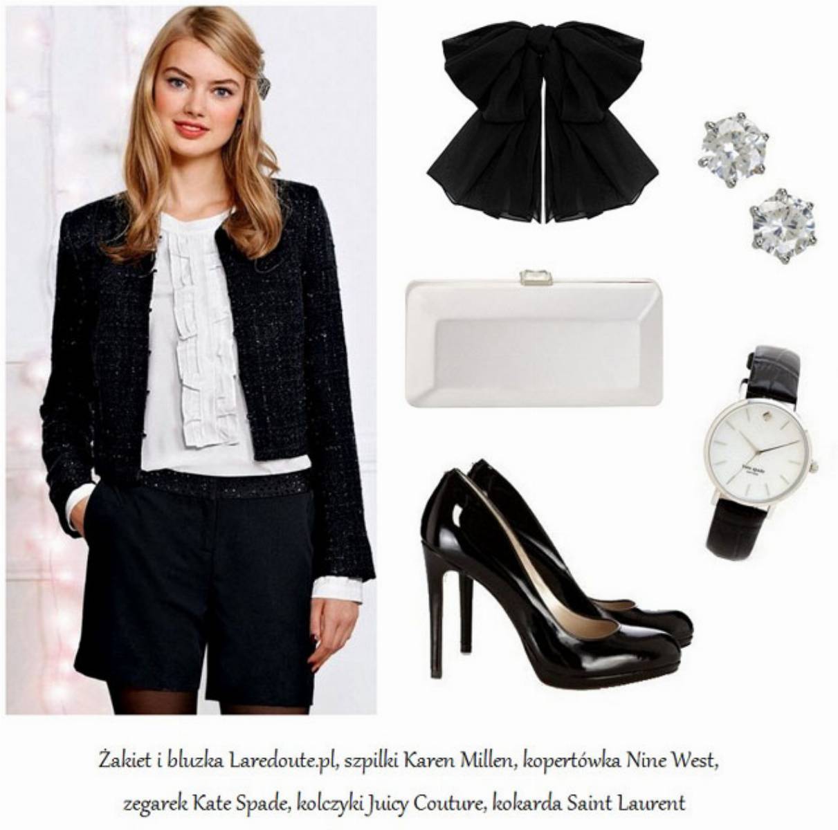 Kolejna nasza propozycja to klasyczne połączenie czerni i bieli, nawiązujące nieco do ponadczasowego stylu lansowanego niegdyś przez Coco Chanel. Żakardowa marynarka o pudełkowym kroju będzie ciekawie wyglądać w połączeniu z czarnymi, krótkimi spodniami i dużą kokardą. Eleganckie szpilki wydłużą optycznie nogę, a skąpana w bieli pudełkowa kopertówka doskonale dopełni całości. Jeszcze tylko drobne akcenty w postaci kolczyków oraz stylowego zegarka i stylizacja na świąteczne przyjęcie w pracy gotowa!