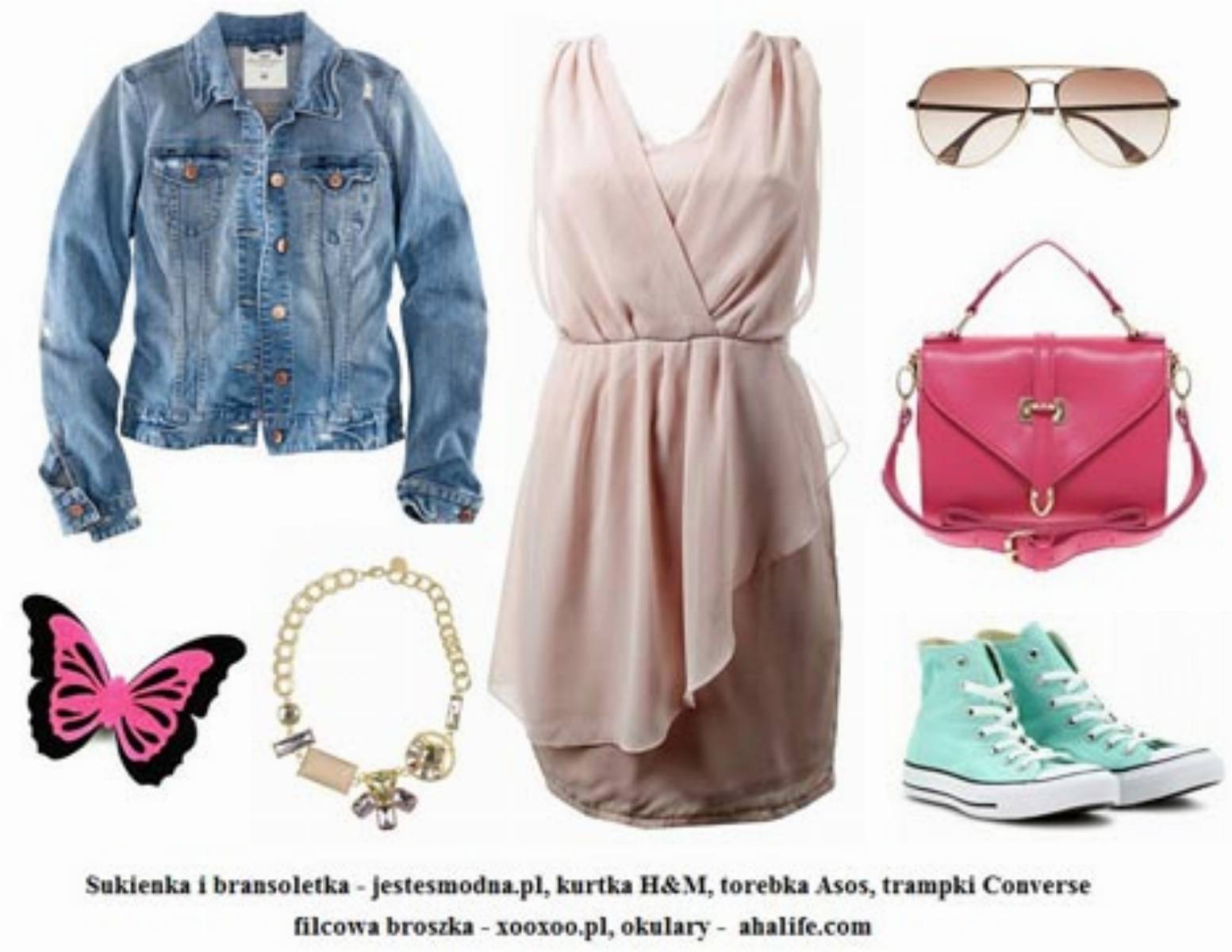 Miętowe trampki i neonowa torebka – potraktuj tę uroczą sukienkę z przymrużeniem oka i połącz ją z wiosennymi, kolorowymi dodatkami. Jeansowa kurteczka podkreśli niezobowiązujący charakter tego zestawu, a przeciwsłoneczne okulary to przydatny i zawsze modny dodatek. Pokaż, że nawet w wygodnej, sportowej stylizacji można wyglądać kobieco!
