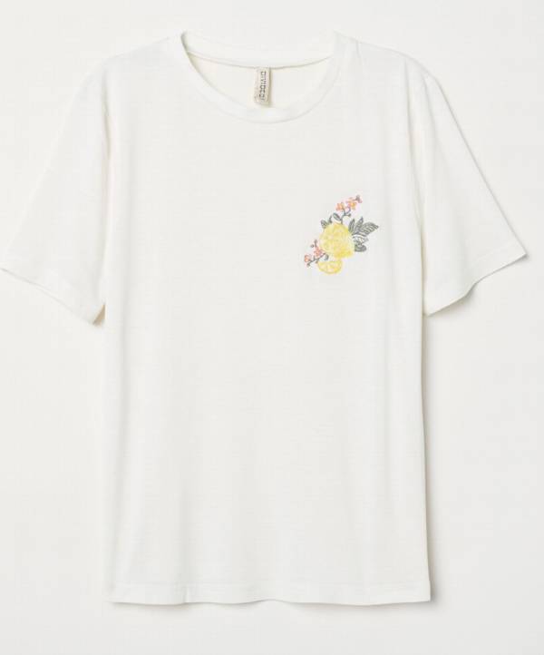 Biała koszulka z cytrynowym haftem – H&M, 34,90 zł
