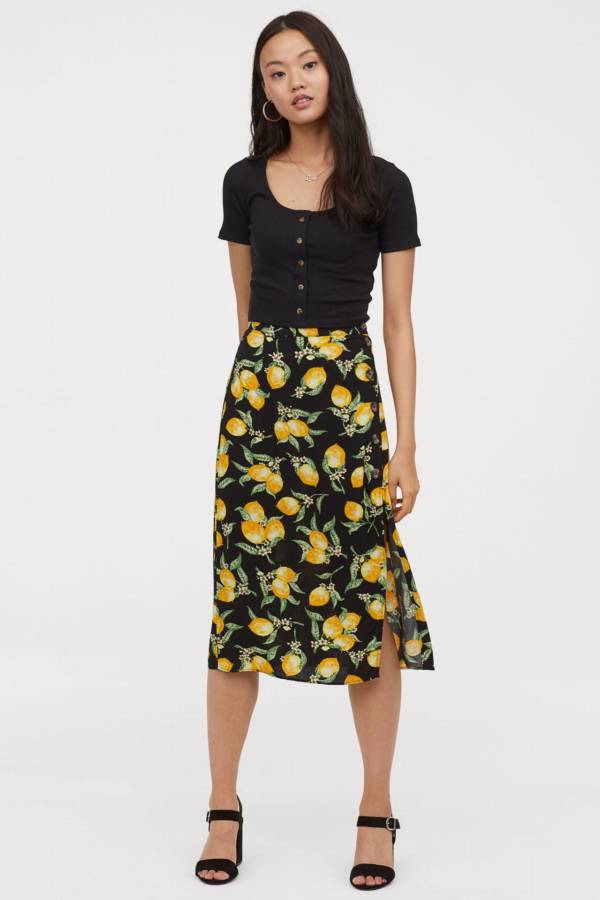 Czarna spódnica za kolano z gęstym nadrukiem – H&M, 79,99 zł