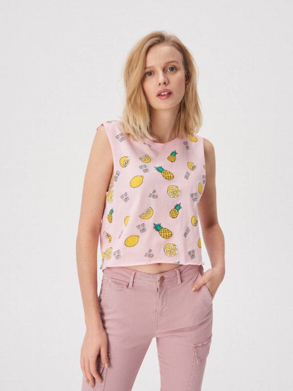 Jasnoróżowy top w cytryny i ananasy – Sinsay, 19,99 zł