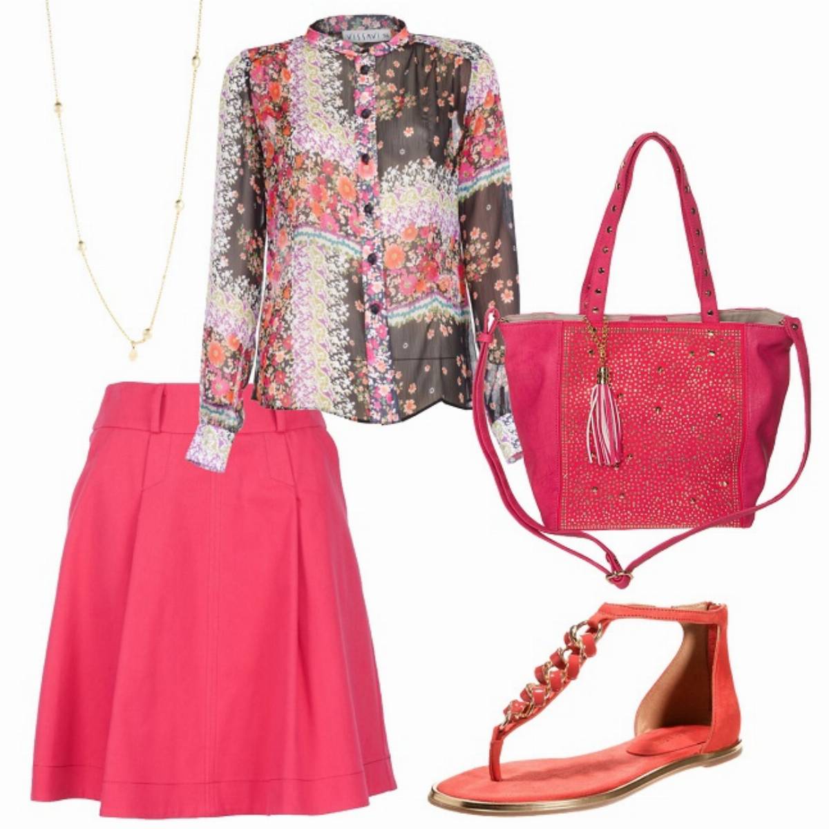 Elegancka, wzorzysta bluzka Vissavi w kolorowe kwiaty i ze stójką przeniesie nas z wybiegu prosto na ulicę. Zapinana na guzki, z listwą wykończoną falbanką i z długim rękawem, ochroni przed słońcem i zapewni komfort dzięki wykonaniu z przewiewnej, chłodzącej tkaniny. Najlepiej wygląda w połączeniu z wdzięczną, malinową spódnicą uszytą z 4 rozszerzanych klinów i z kieszeniami po bokach. Look dopełniamy wyrazistą torbą i super modnymi płaskimi japonkami w zbliżonej tonacji.