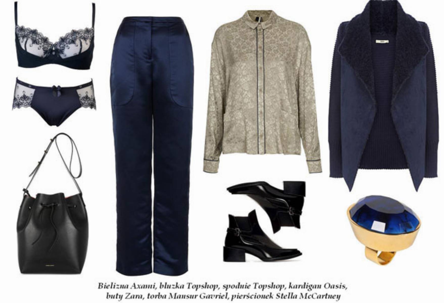 Satyna w męskiej stylizacji jest niebywale seksowna. Granatowe spodnie oraz złota, pięknie zdobiona, jedwabna bluzka to bardzo wygodne zestawienie, które sprawdzi się świetnie na co dzień oraz w pracy. Oczywiście dla tych z Was, które nie muszą przestrzegać ścisłego dress codu. Gruby kardigan bardzo fajnie kontrastuje z delikatnymi tkaninami. Jest ciepły, a jego fason jeszcze bardziej podkreśli męski styl tego zestawu. Stylizację tę doskonale dopełnią wygodne sztyblety oraz stylowa torba w formie worka. Piękny, duży pierścień zwraca uwagę. Całości dopełni efektowna bielizna. Propozycja od marki Axami jest strzałem w dziesiątkę. Koronkowe wykończenia są niezwykle seksowne. Ładnie skrojone pełne figi nie będą odznaczać się pod delikatnym materiałem spodni, a biustonosz typu balkonetka utrzyma biust na swoim miejscu.