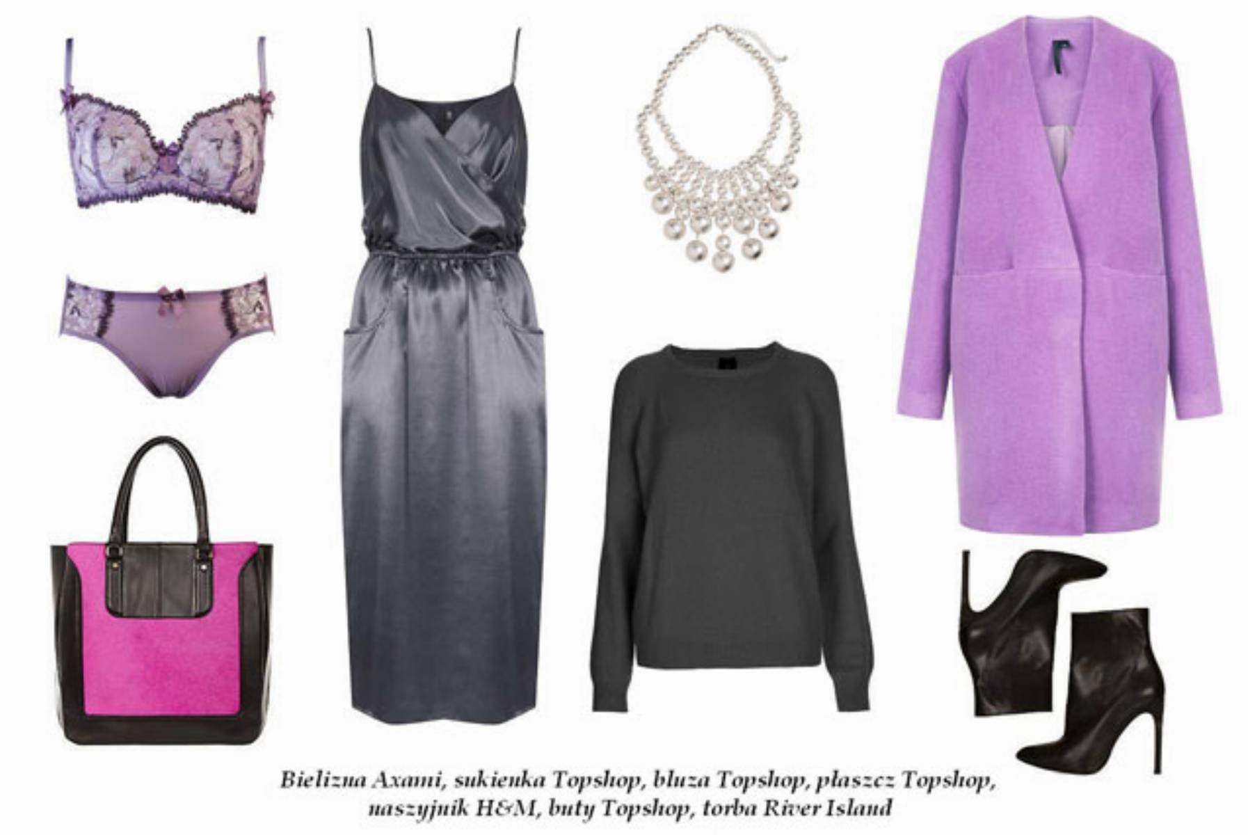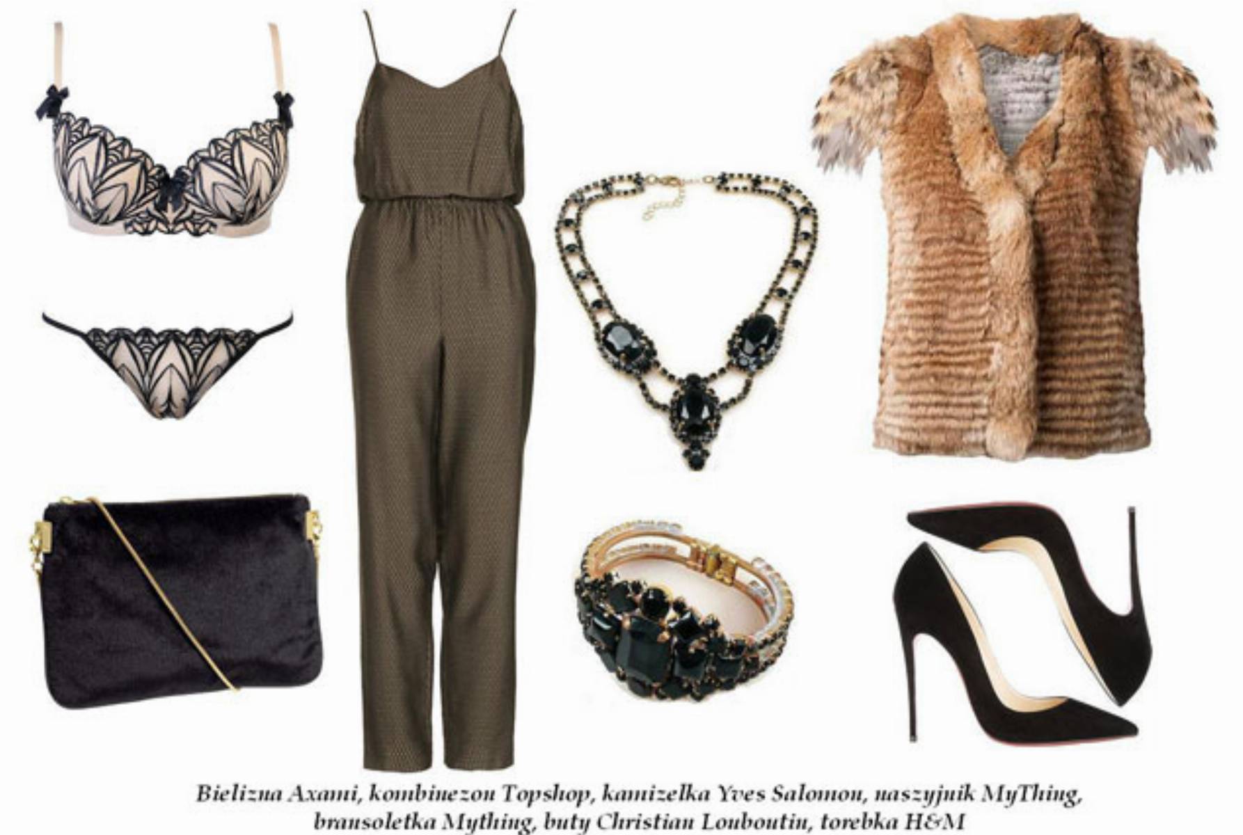 Naszą ostatnią propozycją jest satynowo – żakardowy kombinezon w miedzianym kolorze. Imprezowo – wieczorowy look tej stylizacji podkreśli futrzana, bardzo oryginalna kamizelka. Elegancji doda okazała biżuteria: piękna kolia oraz spora bransoleta z czarnymi kamieniami. Czarne, wysokie szpilki wydłużą nogi i dodadzą tej kompozycji kobiecości, a torebeczka na delikatnym łańcuszku zmieści wszystkie przydatne drobiazgi. Pod kombinezon idealnie sprawdzą się malutkie stringi oraz dopasowany biustonosz. Wygodna bielizna to podstawa dobrego samopoczucia. Piękne wzornictwo marki Axami urzeka i gwarantuje doskonały efekt.