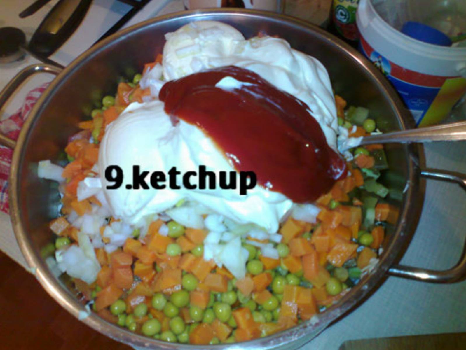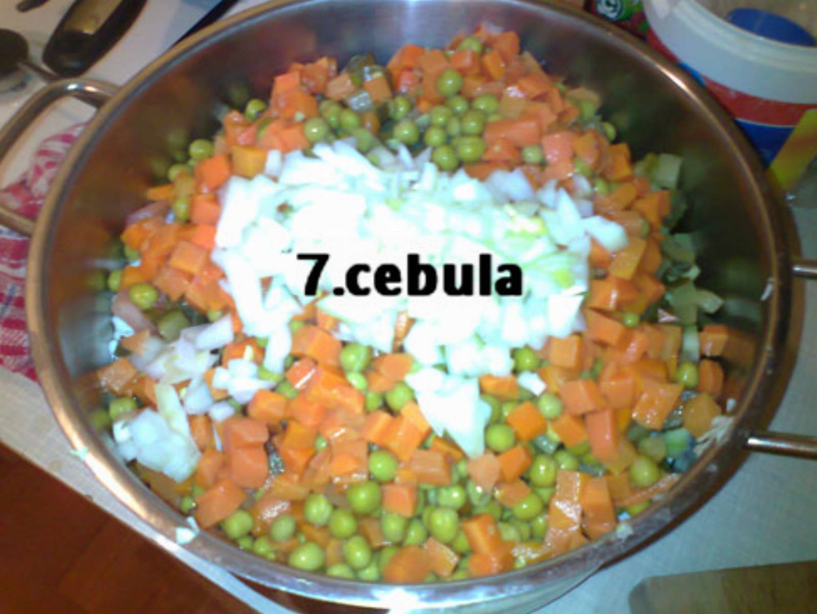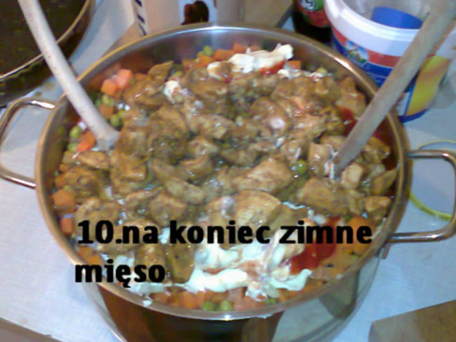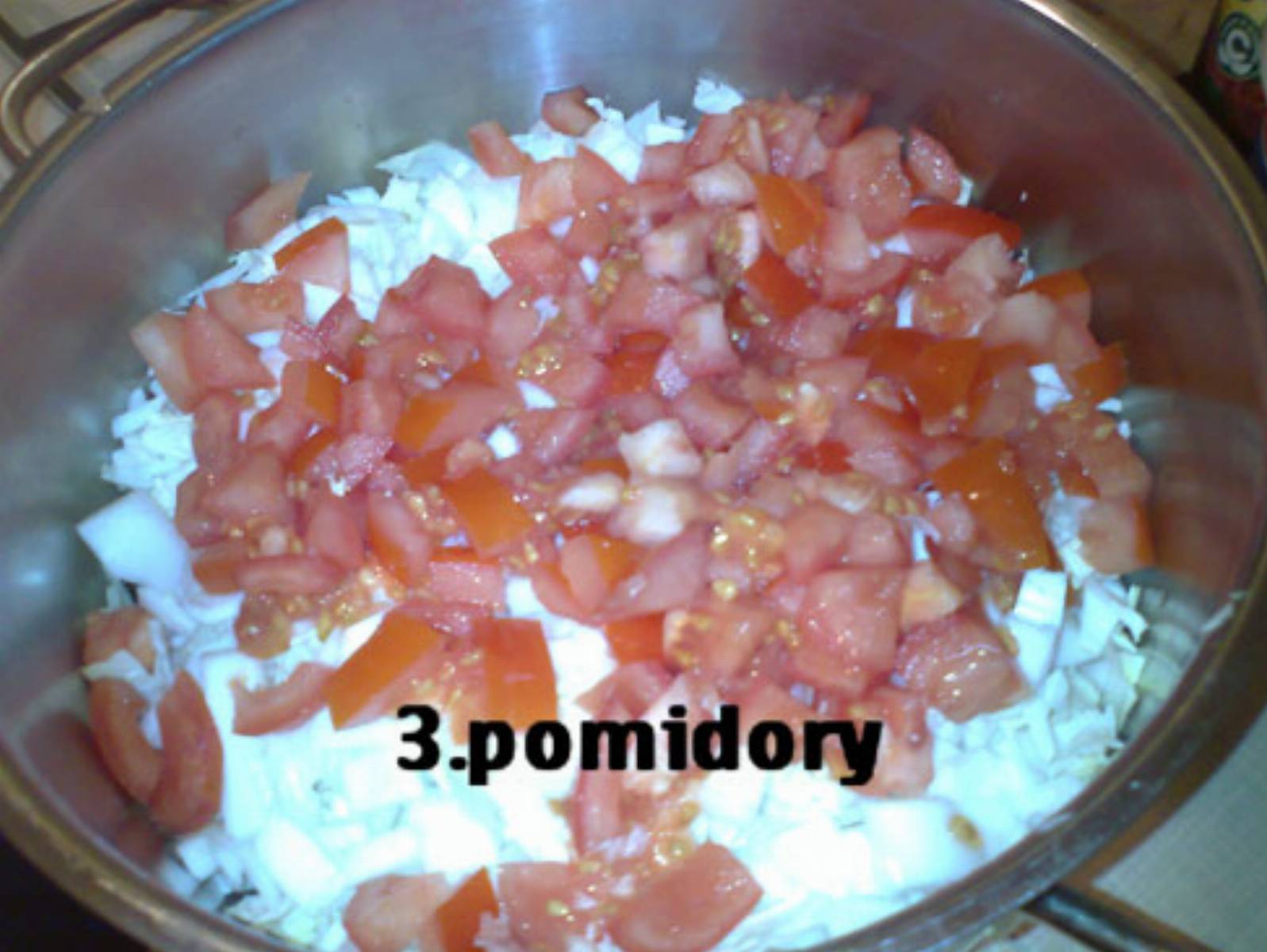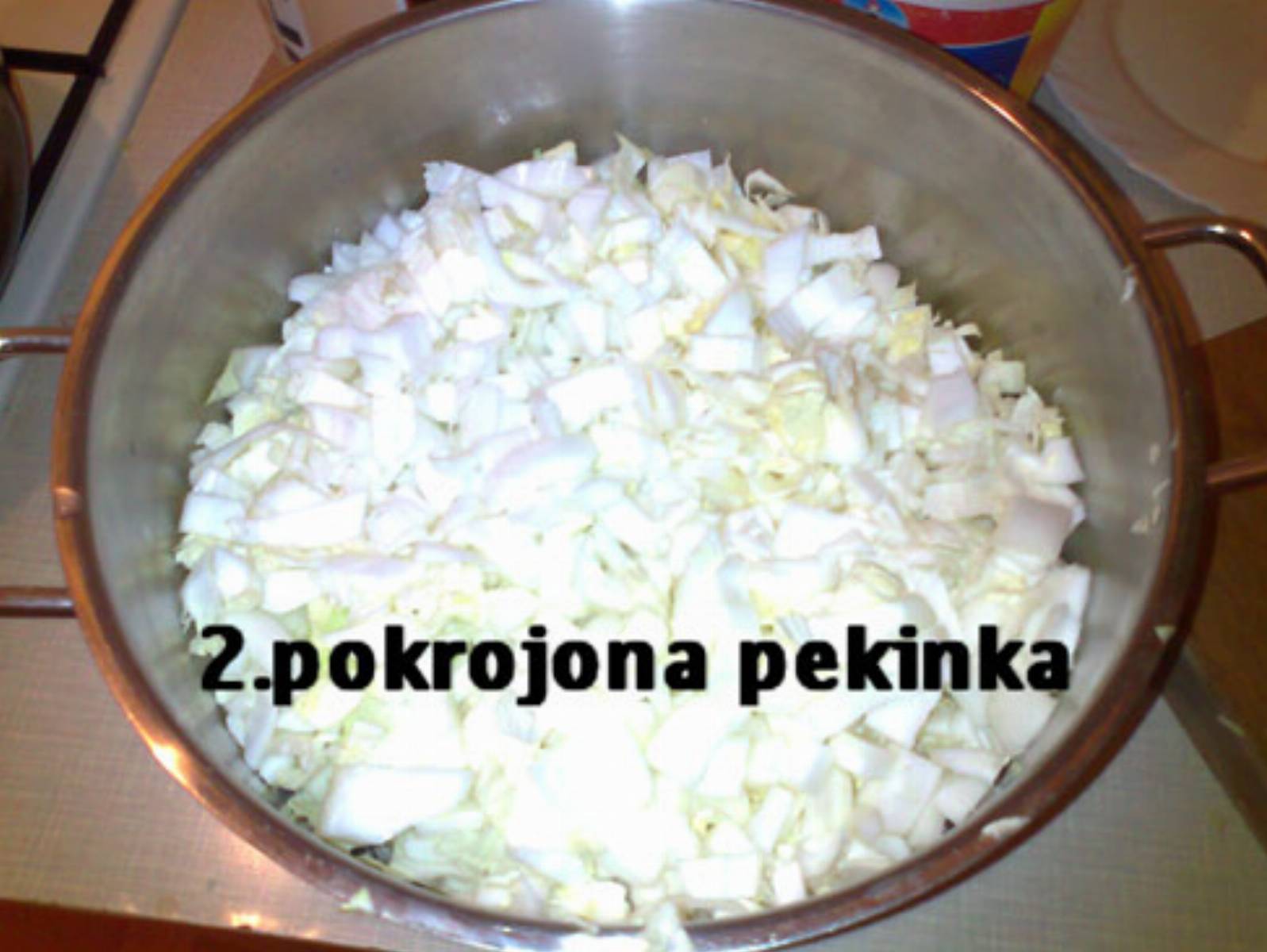 Następnie kroimy kapustę pekinkę, pomidory, ogórka świeżego, ogórki kiszone, groszek z marchewką, cebulę, majonez, ketchup, sól i pieprz, a na koniec zimne mięso.