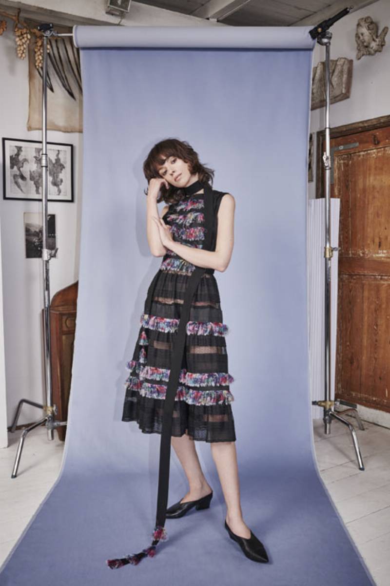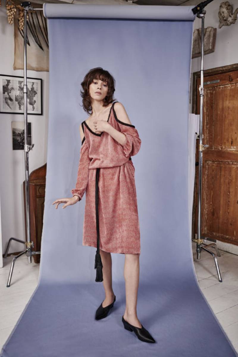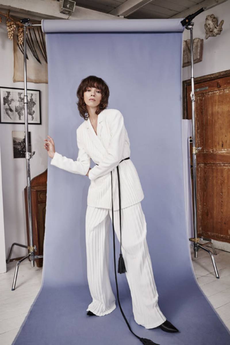 Kolejny, wyrazisty element kolekcji to aplikowane na kamizelkę, kopertową spódnicę czy sukienkę kolorowe frędzle, ręcznie prute z kwiecistej tkaniny. W kolekcji pojawiają się także delikatne koraliki, które gustownie inkrustują górę męskiej w kroju kamizeli. Tkaniny w kolekcji “Belle de Jour” to przede wszystkim jedwabie pod postacią lekkiego muślinu i strukturalnego żakardu, cienka wełna, duże spektrum koronek, welur pod postacią drobnych kropek na jedwabnej bazie czy też delikatna bawełna.