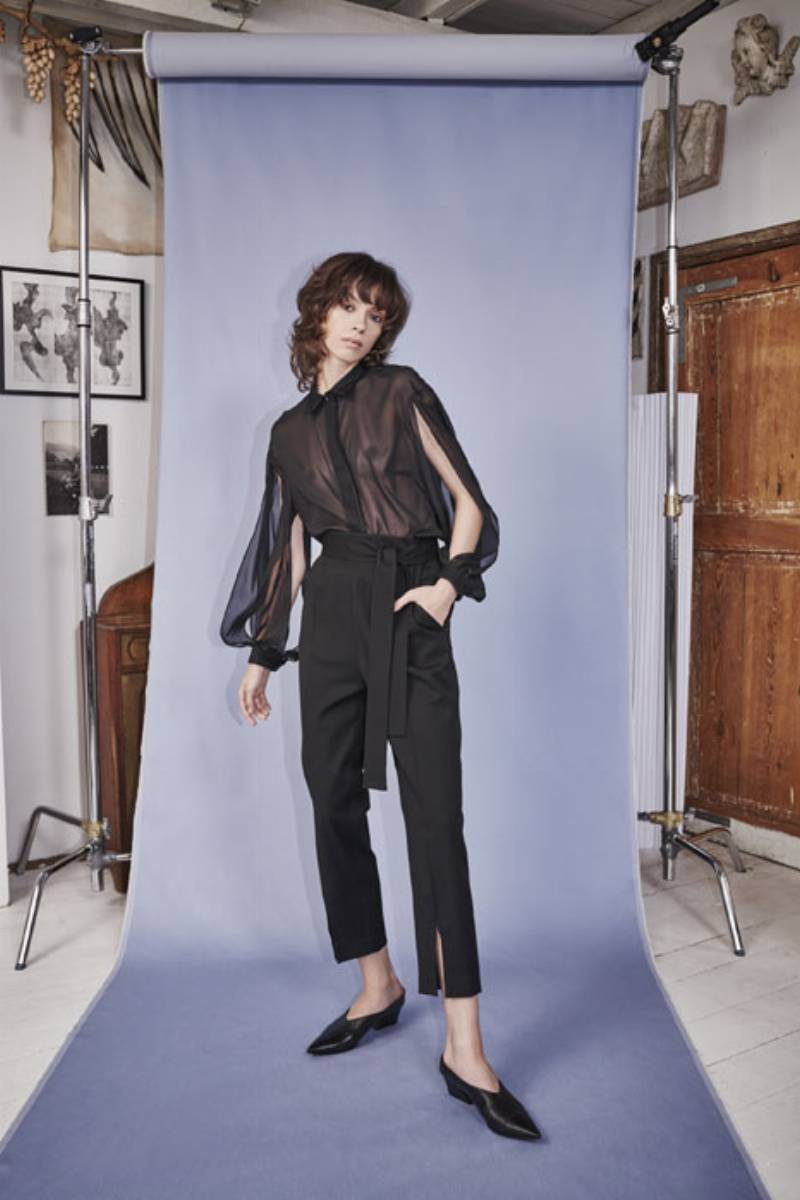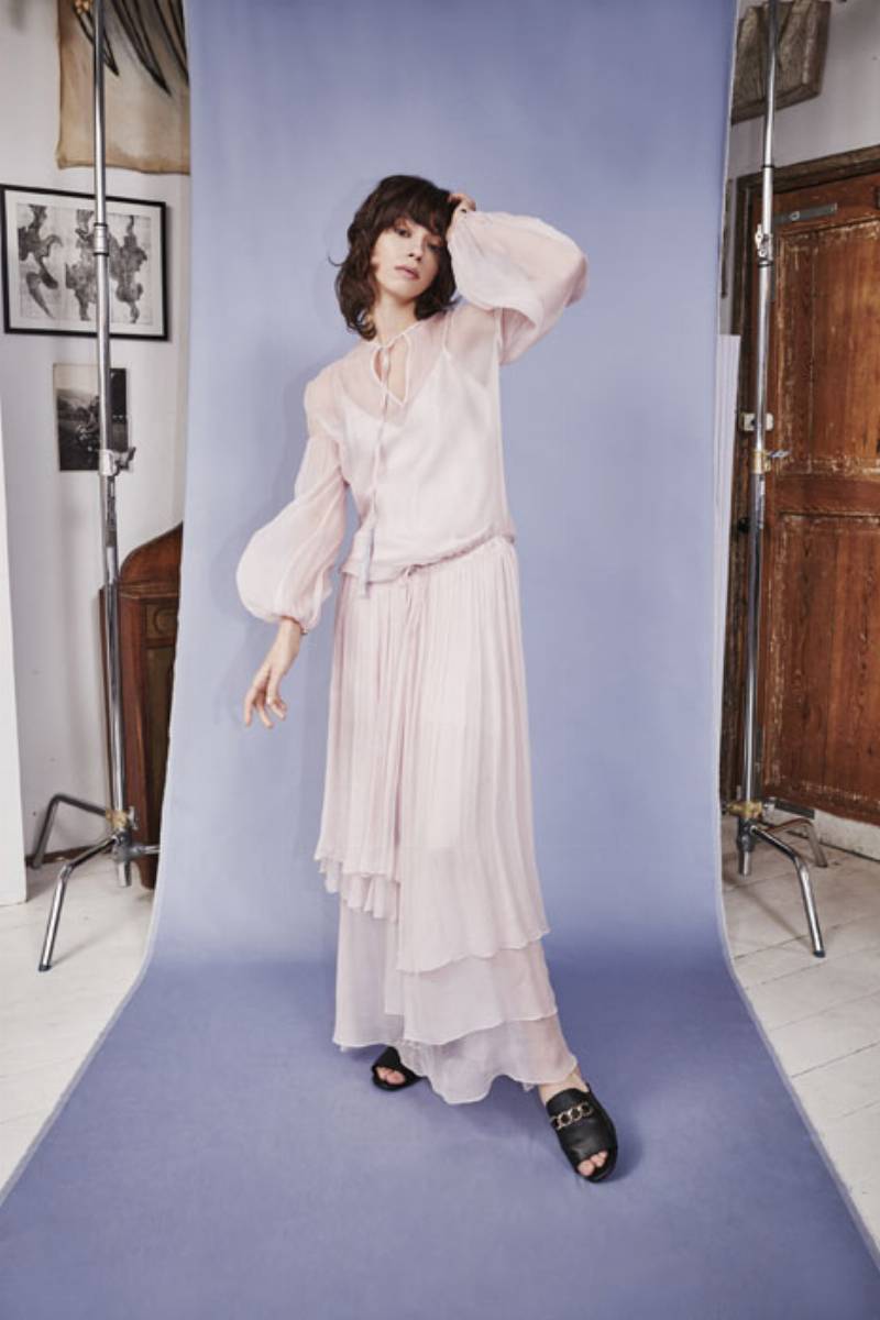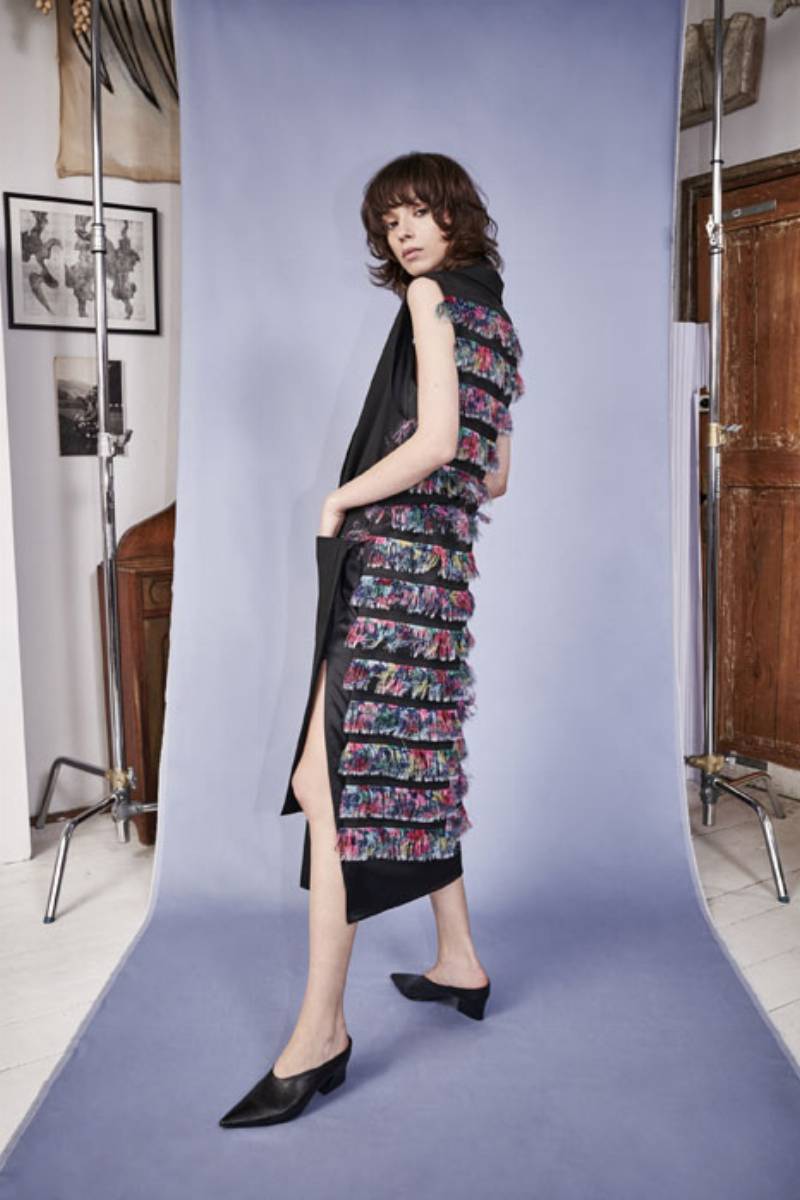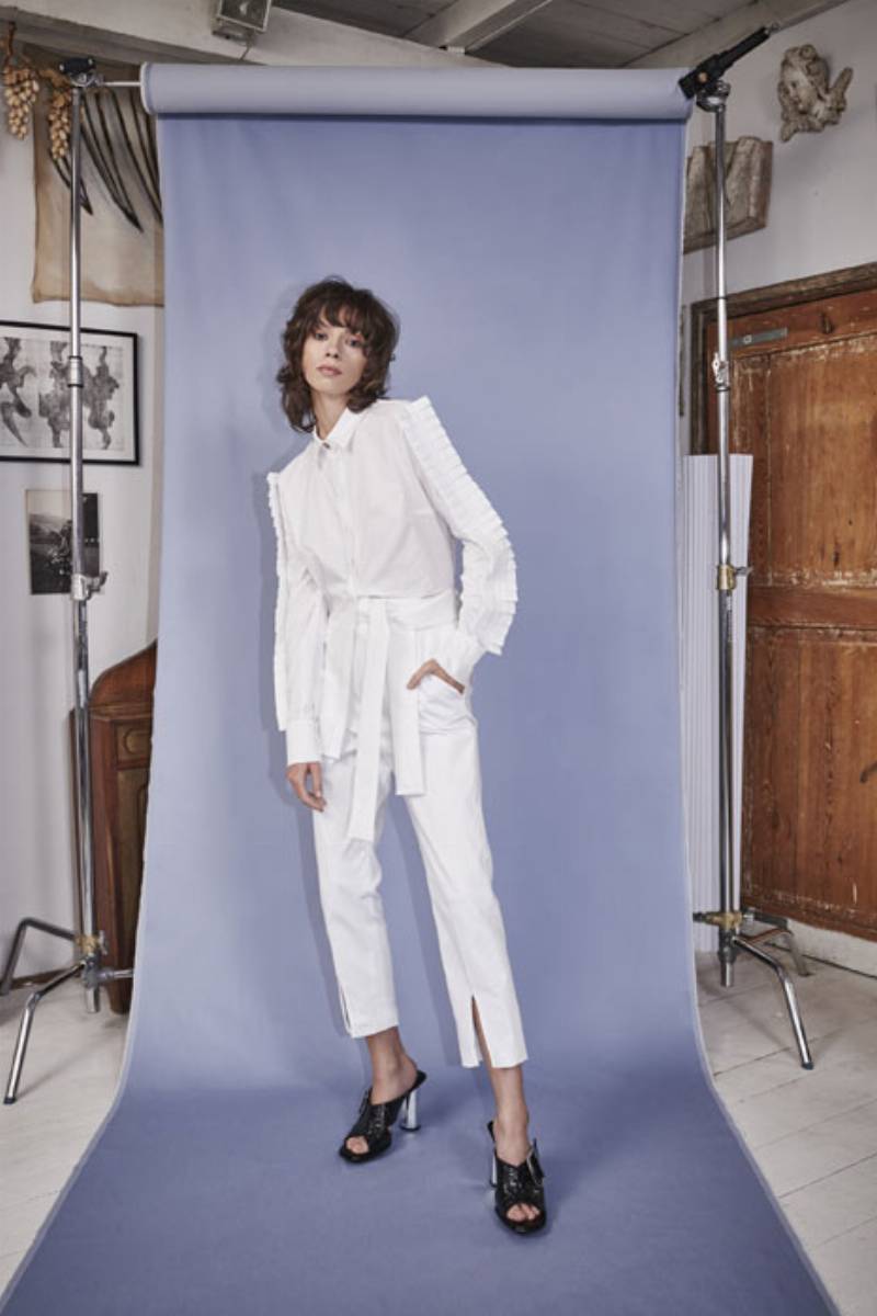 Kolejny, wyrazisty element kolekcji to aplikowane na kamizelkę, kopertową spódnicę czy sukienkę kolorowe frędzle, ręcznie prute z kwiecistej tkaniny. W kolekcji pojawiają się także delikatne koraliki, które gustownie inkrustują górę męskiej w kroju kamizeli. Tkaniny w kolekcji “Belle de Jour” to przede wszystkim jedwabie pod postacią lekkiego muślinu i strukturalnego żakardu, cienka wełna, duże spektrum koronek, welur pod postacią drobnych kropek na jedwabnej bazie czy też delikatna bawełna.