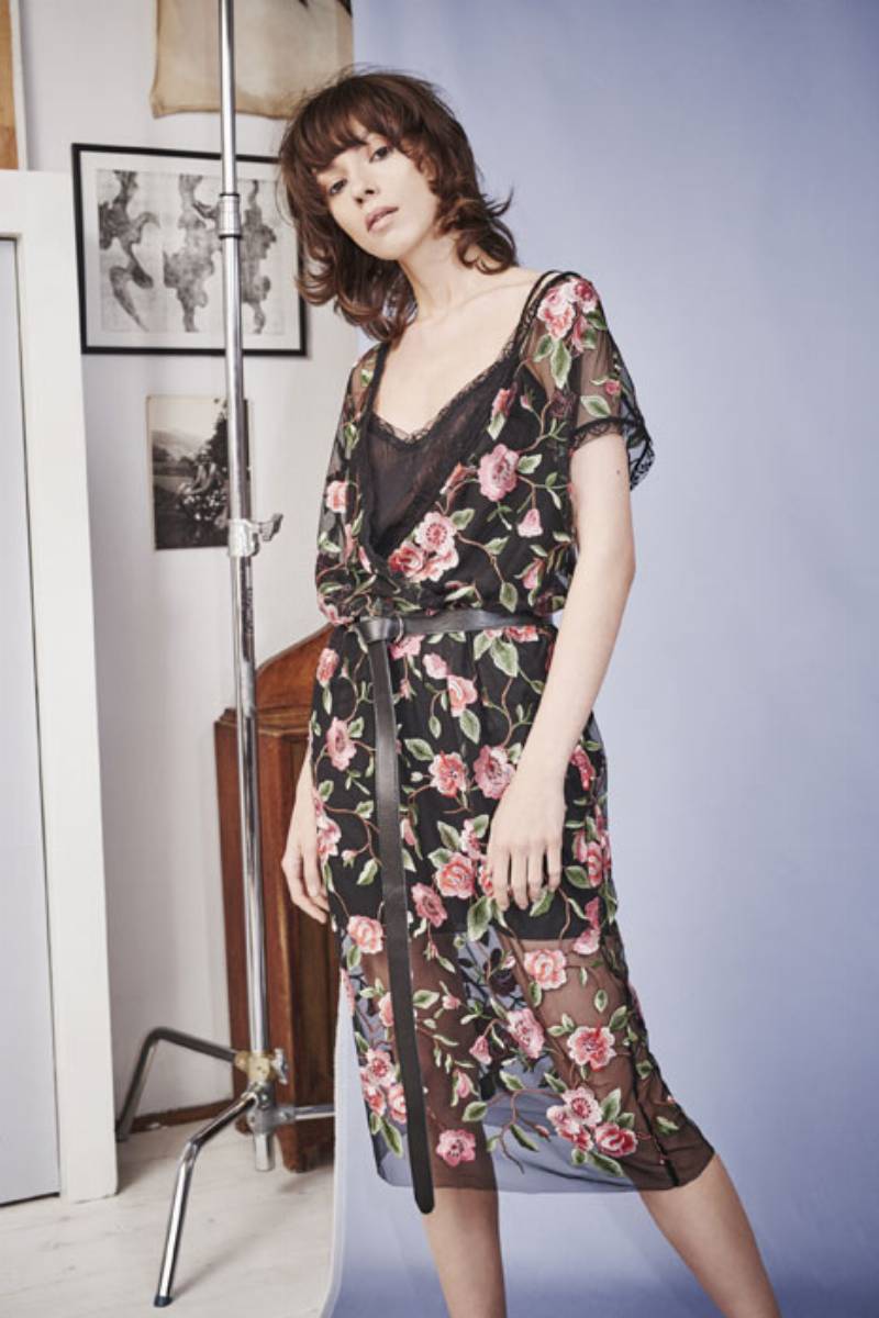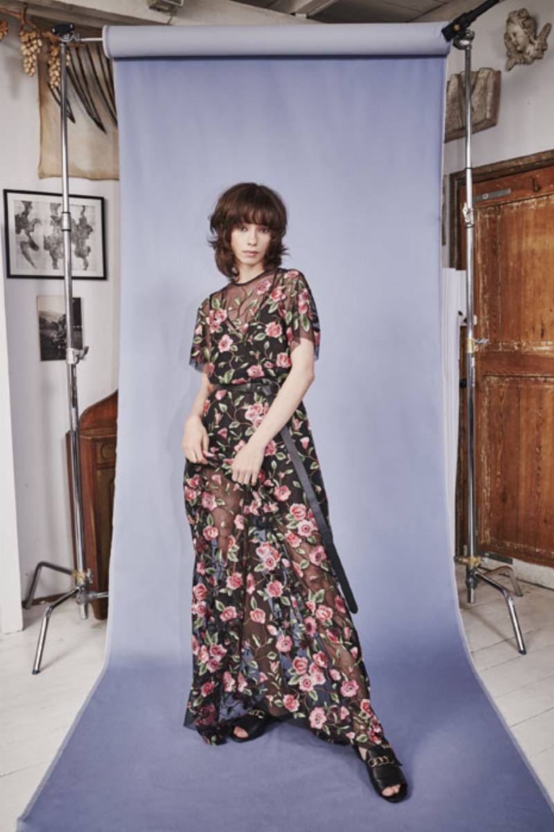 Koronki w kolekcji to nie tylko te linearne czarne ażury. To zaczerpnięte wprost z dzikiego ogrodu róże, zwielokrotnione w przeskalowanym, dwuwarstwowym bomberze, zadziornie przycięte w wysoko taliowanych dzwonach, delikatnie orientalne w sukience z kimonowo krojoną górą i wreszcie intensywnie kwiatowe w wieczorowej, długiej sukni.