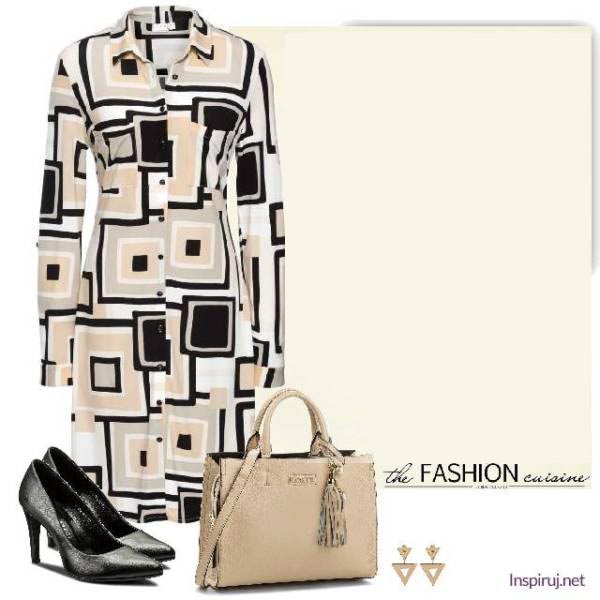 Ubrania z geometrycznymi wzorami są zwykle ekscentryczne i trudne do skomponowania z pozostałymi elementami garderoby. Kojarzą się raczej z celebrytkami i modelkami niż ze zwykłymi kobietami, których głowy zaprząta wiele codziennych spraw. Duże printy o kontrastujących krawędziach potrafią zresztą zdominować cały outfit, a nawet zaburzyć optycznie kształt naszej sylwetki, zwłaszcza w nieumiejętnie dokonanych zestawieniach. Szykowna koszulowa sukienka od Bonprix zapinana na guziki, bazująca na połączeniu trzech jasnych i jednego ciemnego koloru, nie potrzebuje jednak żadnej szczególnej oprawy, by prezentować się świetnie w każdej sytuacji, w której wskazana jest elegancja. Minimalistyczny zestaw z czarnymi czółenkami (nasza Inspirantka wybrała szpilki od Sergia Bardiego) i niewielką torebką (w kolażu torebka marki Kazar) dopasowaną do jednego z jasnych odcieni widocznych na materiale sukienki oraz z kolczykami zwieńczonymi inną geometryczną figurą – trójkątem walczącym o dominację z sukienkowymi kwadratami – tworzy nowoczesny look, idealny dla pewnej siebie kobiety, która zawsze realizuje swoje plany i odważnie kroczy przez świat!