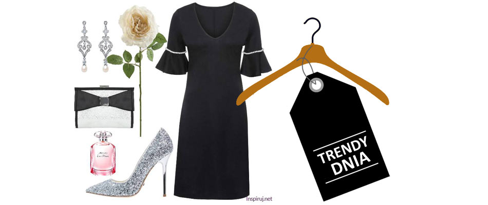 Poniższy outfit w pełni oddaje atmosferę majowego spotkania. Sukienka od Bonprix o modnych, rozkloszowanych rękawkach ozdobionych perełkami, uzupełniona o skrzące się, srebrne szpilki Buffalo pokryte brokatem, eleganckie kolczyki z ciekawym wzorem, cyrkoniami i perełką oraz słodką, srebrną kopertówkę Nobo z kokardą, która zmieści się w dłoni, tworzy zestaw nieco w stylu współczesnej Audrey Hepburn (choć aktorka pewnie uzupełniłaby go o długie, czarne rękawiczki). Klasyczna mała czarna będzie pewnym wyborem na każde wyjście, a blask dodatków sprawi, że wszyscy zmrużą oczy! Kobiecego, szykownego looku dopełnią perfumy o wiosennych, kwiatowych nutach (np. Ever Bloom Shisheido).