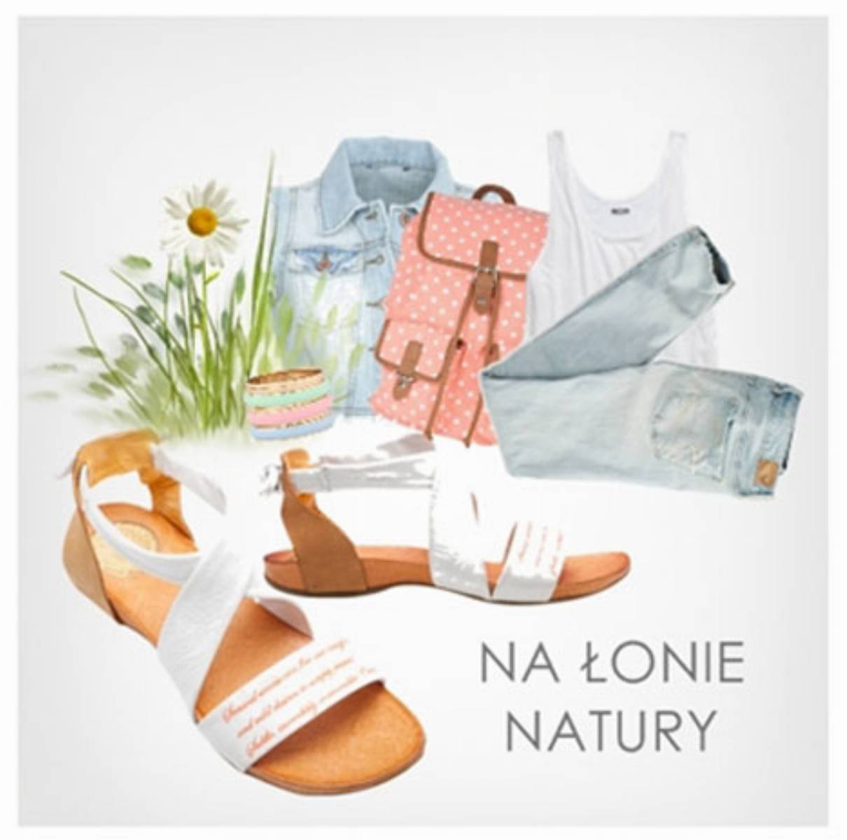 Im cieplej, tym więcej mieszczuchów ucieka w weekend za miasto. Nadchodzący długi weekend to idealny moment, by na własnej skórze poczuć pierwsze promienie majowego słońca. Cisza, spokój i błogie lenistwo. Mniej leniwi, a właściwie leniwe, mogą wsiąść na rower, spacerować lub w inny bardziej aktywny sposób rozkoszować się wolnymi dniami. Majówka na łonie natury to czas luzu i swobody. Jeansy, koszulka, kamizelka, plecak, a na nogach skórzane sandały w dwóch odcieniach bieli. Proste, zgrabne, ale niepozbawione charakteru. Ozdoba w postaci gustownego cytatu nie pozwala przejść obok nich obojętnie.