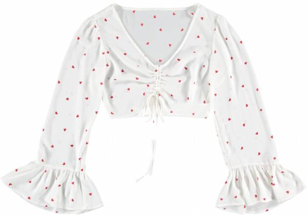 Idealny wzór na wiosenną randkę? Oczywiście serduszka! Ta romantyczna bluzka z falbankami przy rękawach dobrze komponuje się zarówno z dżinsami, jak i ze spódnicą.