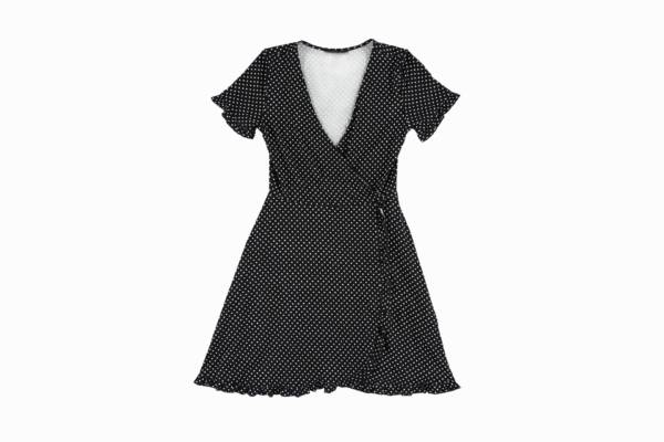 Miłośniczkom klasyki na pewno spodoba się też kopertowa sukienka w drobne groszki. Trudno o bardziej kobiecy fason i wzór.