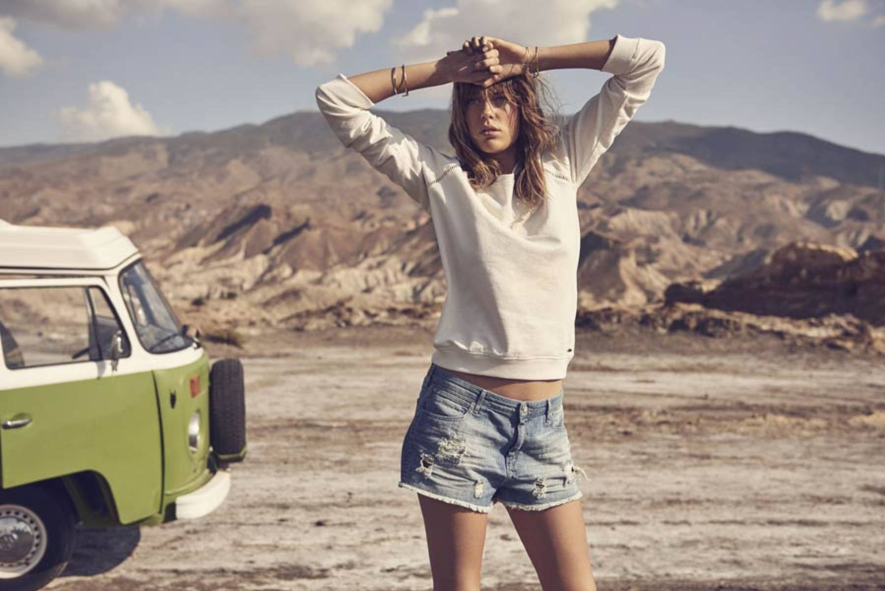 Ducha tamtych lat dodatkowo podkreślają wzór bandany paisley oraz kultowe duże kraty drwala, które są wykorzystane w koszulach i kurtkach w stylu bomber. Na gorące letnie dni marka przygotowała szorty, dżinsy nad kostkę i luźne topy uszyte z naturalnych strukturalnych tkanin w neutralnych odcieniach kości słoniowej, bladoniebieskiego i jasnego beżu. Detale w stylu vintage – postrzępione brzegi, rozdarcia i inne efekty nadające dżinsom znoszony wygląd – sprawiają, że każda para wygląda jak ulubione spodnie noszone od wielu lat. Plaża jest popularnym miejscem odpoczynku podczas letnich wakacji.