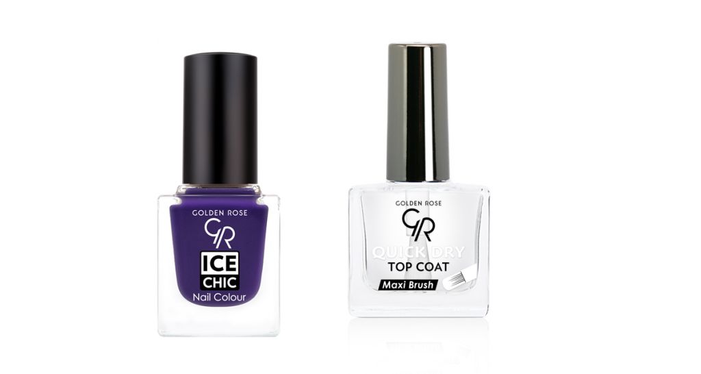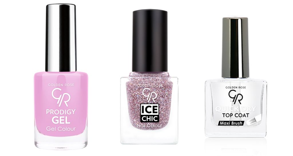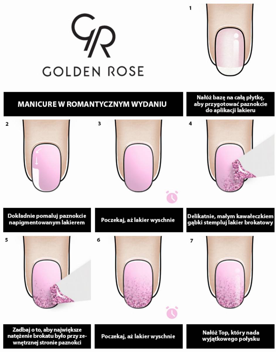 Pierwsza propozycja od Golden Rose jest zgodna z najnowszymi trendami, niezwykle kobieca i przyciągająca uwagę. Aby ją wykonać należy pokryć płytkę paznokcia mocno napigmentowanym lakierem w kolorze subtelnego różu np. Prodigy Gel Colour, który nada całości żelowego wykończenia. Po całkowitym wysuszeniu lakieru bazowego możemy przejść do wykonania zdobienia.