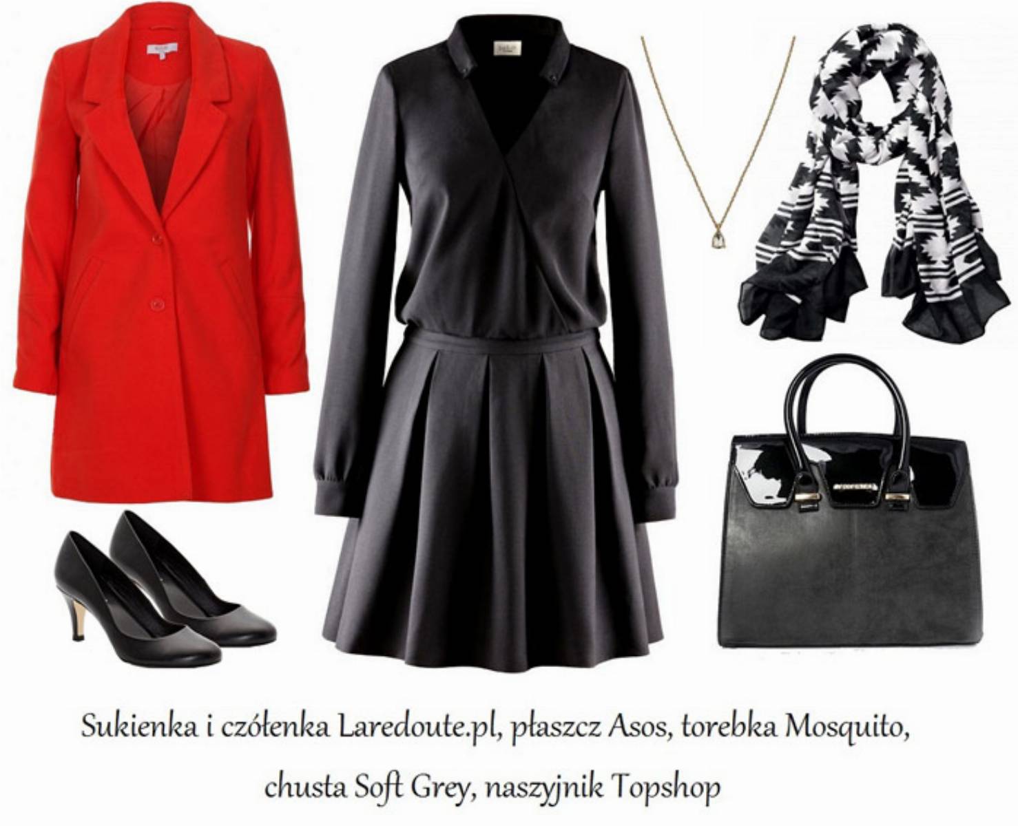 Czarna sukienka z koszulową górą i rozkloszowanym dołem ze sklepu Laredoute.pl w połączeniu ze stylowymi czółenkami oraz elegancką torbą w tym samym kolorze da nam świetny biurowy look, który warto urozmaicić subtelnym, złotym wisiorkiem. Aby w drodze do pracy nie zlewać się z tłumem, do sukienki proponujemy dobrać czerwony płaszcz oraz wzorzystą apaszkę. Tym sposobem otrzymamy stylizację, która z pewnością przykuje spojrzenia przechodniów!
