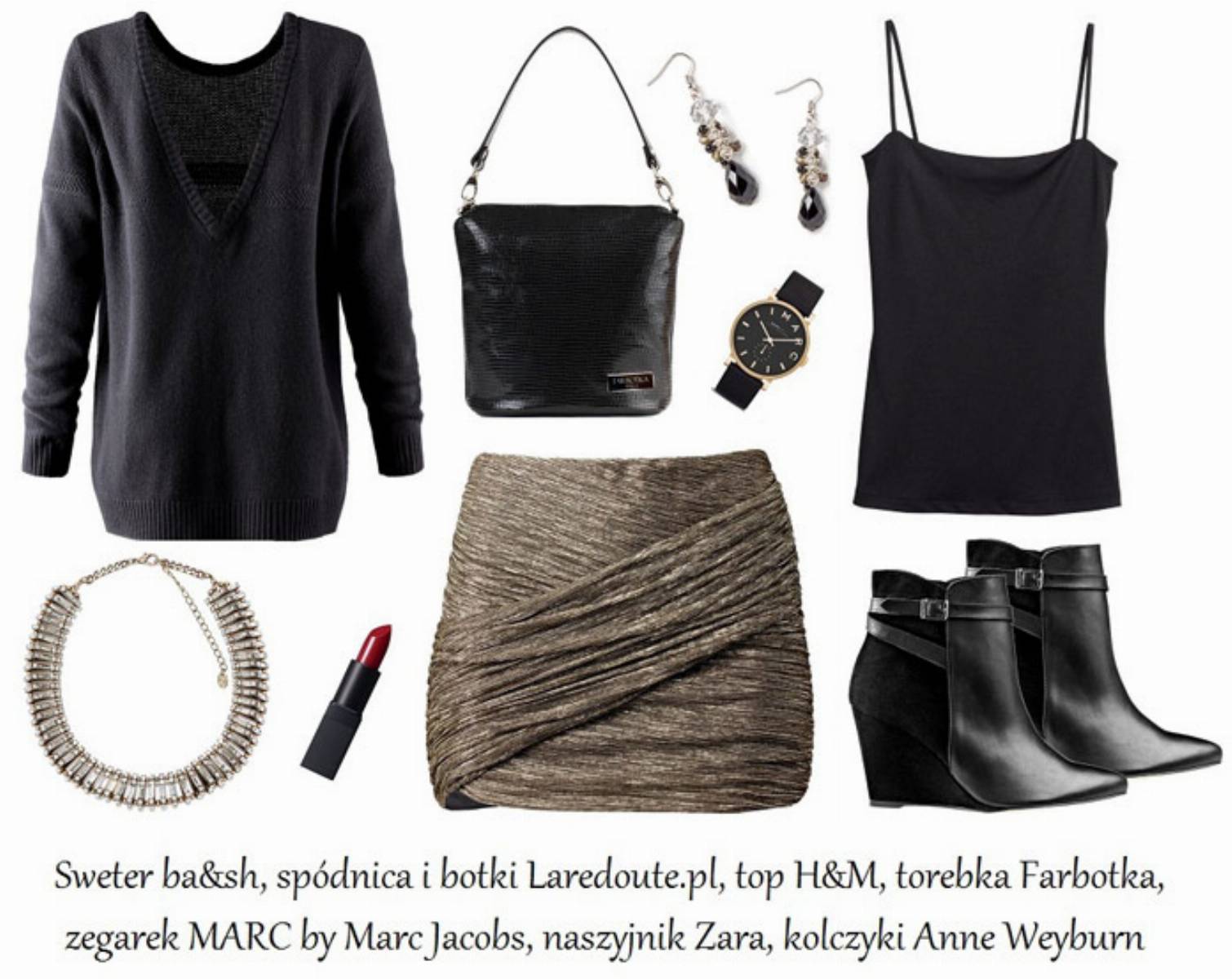 Kobietom, którym brakuje odwagi i które zdecydowanie bardziej wolą stonowane stylizacje, proponujemy ubrania i dodatki w kolorze starego złota, które genialnie się ze sobą komponują. Świetna alternatywa dla szarości! Krótka, drapowana spódniczka marki ba&sh wykonana z mieniącej się tkaniny stworzy zgrany duet z ciepłym swetrem oraz botkami na koturnie. Look ten warto urozmaicić biżuterią w postaci kolczyków lub naszyjnika. Ciekawym elementem tej stylizacji będzie czarna, lakierowana torebka.