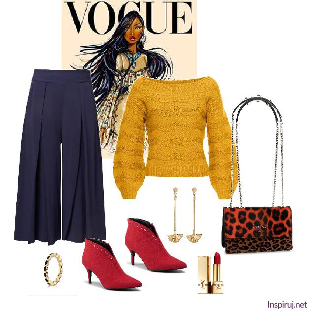 W drugiej odsłonie naszych Trendów Dnia szafranowy swetr pięknie się komponuje ze spodniami od Ralpha Laurena. Ten kontrast nie pozwala oczom uciekać w innym kierunku! Tak ubrana kobieta przykuwa wzrok i nie daje o sobie zapomnieć. Charakterystyczny sweterek, krój spodni, czerwone botki i torebka w zwierzęcy nadruk – te wszystkie elementy – odważnie skomponowane – tworzą harmonijną i spójną całość!