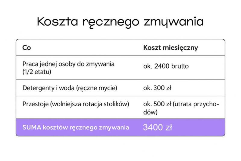 - Koszt ręcznego zmywania: ~3400 zł/miesiąc