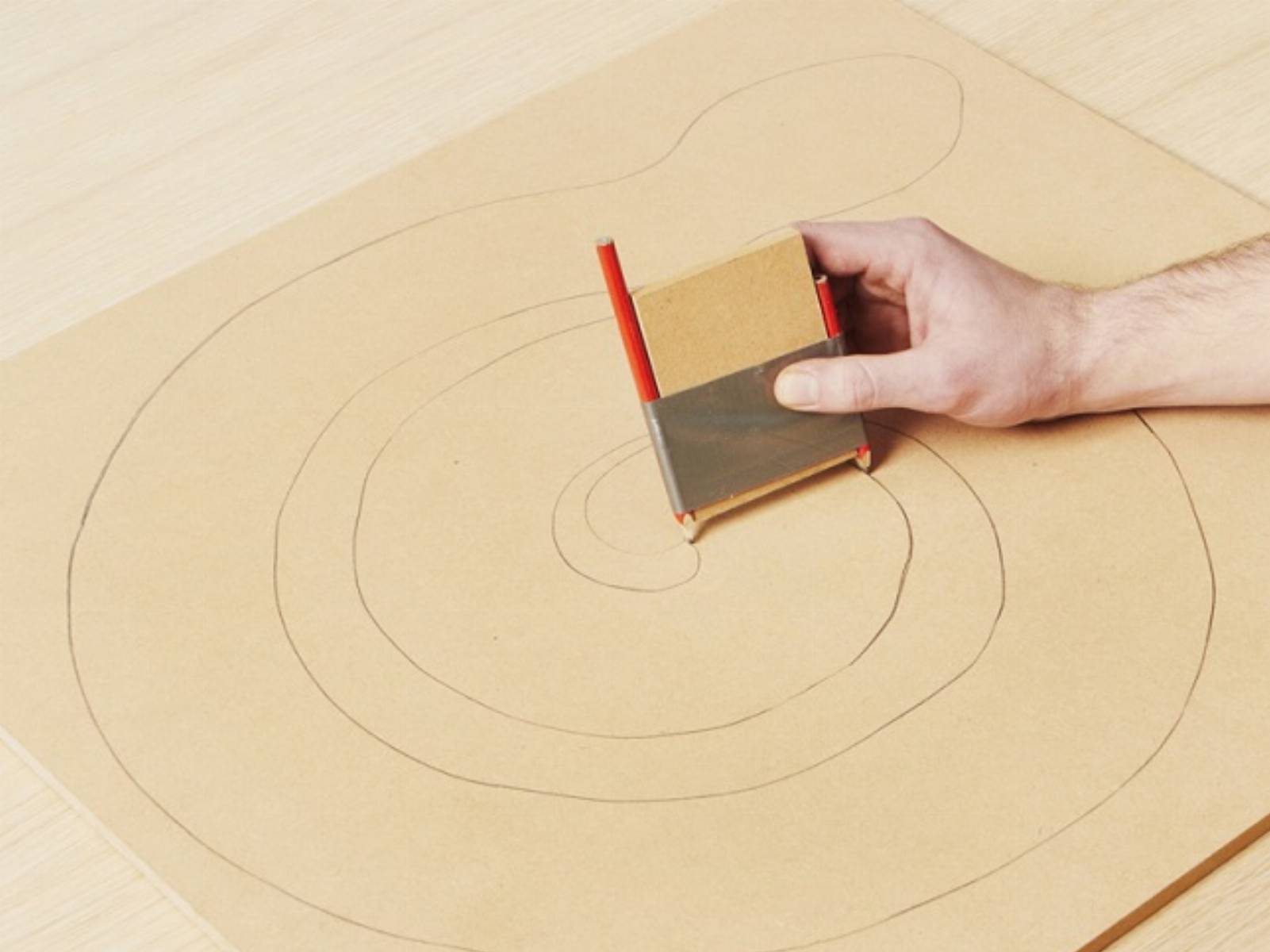 W markecie budowlanym kup płytę MDF, przyciętą na wymiar 55 cm x 50 cm. Narysuj na niej okrąg o średnicy 50 cm. Będzie to podstawowy wzór dla kolorowego węża. Następnie przygotuj „prowadnicę do rysowania”, która pomoże Ci narysować dwie równoległe linie, odwzorowujące kształt węża, wpisane w okrąg o średnicy 50 cm. Aby stworzyć „prowadnicę do rysowania”, przygotuj kawałek drewna o wymiarach 7,5 cm szerokości 10 cm długości. Wykorzystaj do tego wyrzynarkę Dremel Moto-Saw. Teraz przyklej taśmą ołówek do dwóch krawędzi i narysuj zwiniętego węża wewnątrz okręgu. Głowę i ogon narysuj odręcznie.