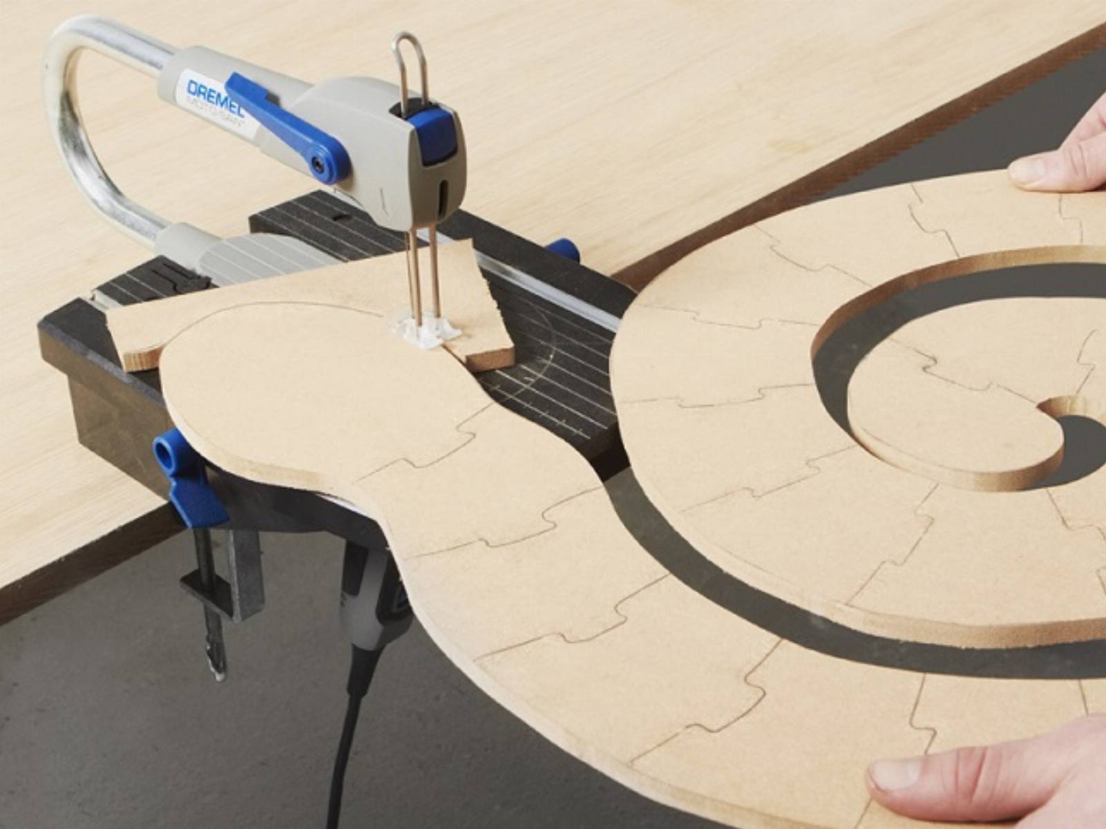 Teraz wytnij segmenty węża, prowadząc cięcia wzdłuż narysowanych linii w kształcie puzzli. W tym celu wykorzystaj Dremel Moto-Saw i brzeszczot do cięcia drewna MS52.