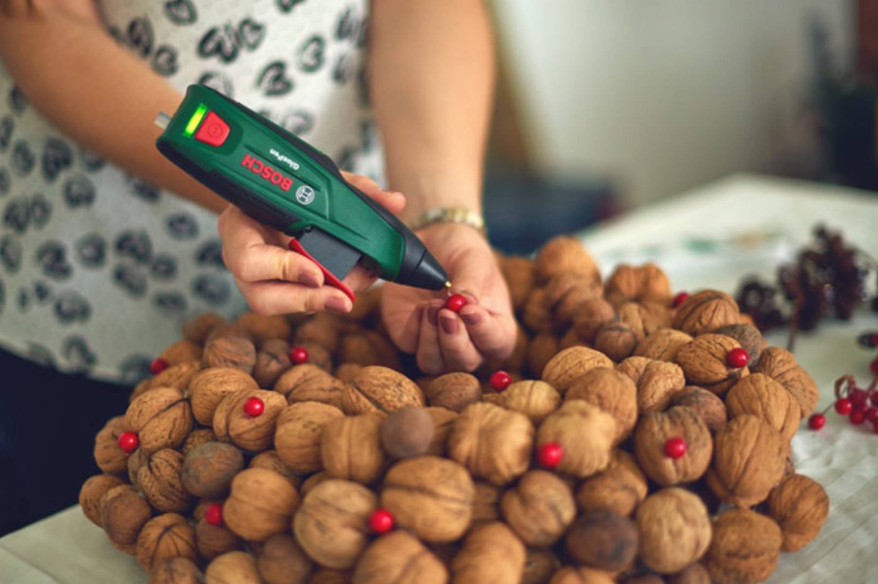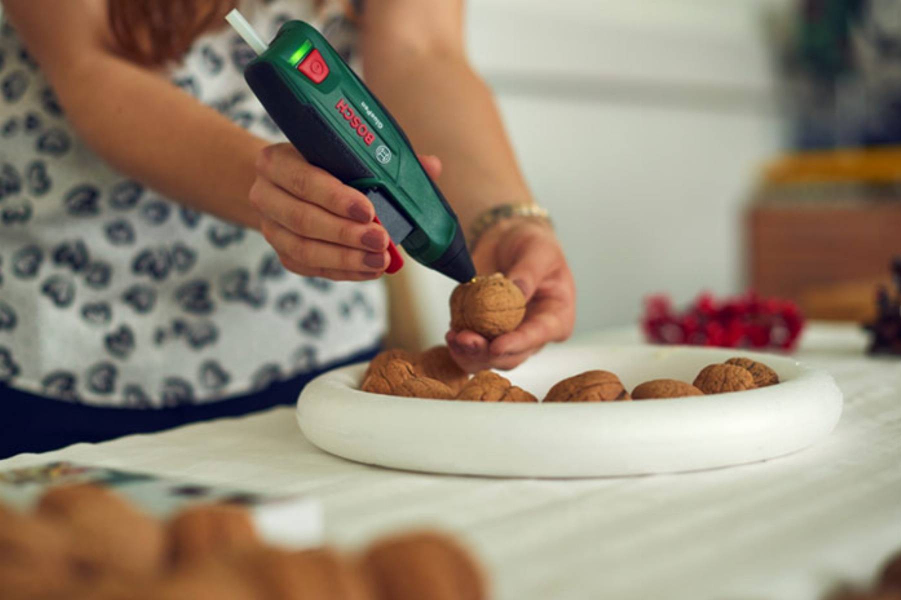 Włącz GluePena, włóż wkład klejący i odczekaj 15 sekund, aż narzędzie się rozgrzeje i będzie gotowe do pracy. Następnie obklej wewnętrzną i zewnętrzną krawędź obręczy styropianowej orzechami włoskimi, nakładając na nie klej.