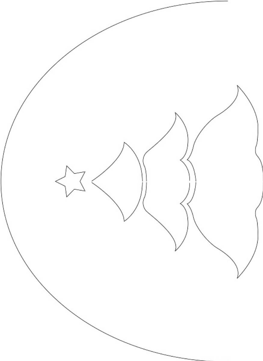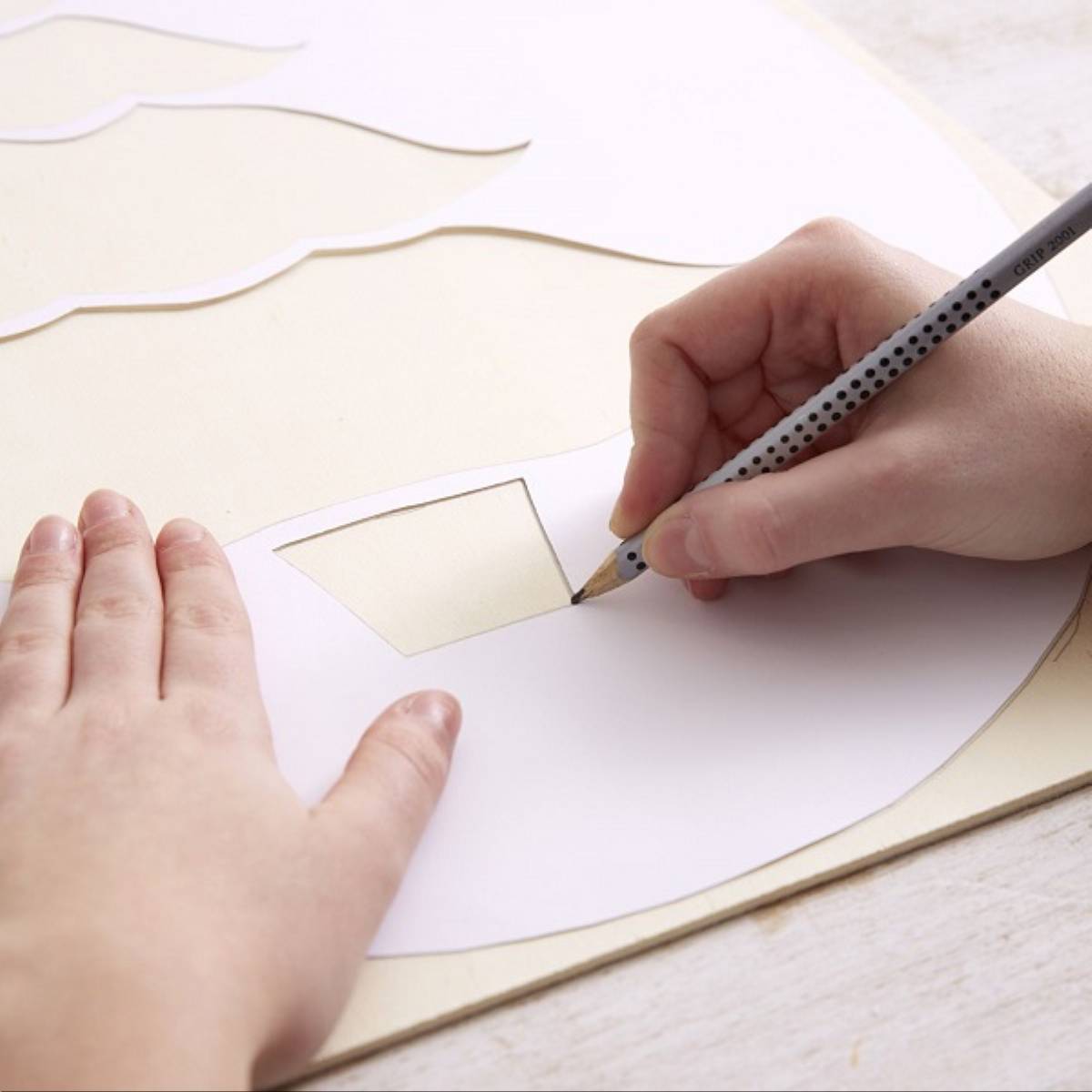 Użyj naszego szablonu do narysowania na kartonie kształtu choinki o długości 40 cm i szerokości 25 cm. Wytnij wzór za pomocą nożyczek i przenieś go przy użyciu ołówka na płytę multiplex o wymiarach 40x60cm.