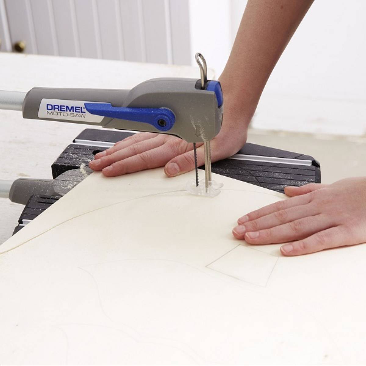 Do wyrzynarki Dremel Moto-Saw zamocuj brzeszczot do drewna do cięć precyzyjnych (MS52) i wytnij owal. Upewnij się, że zachowujesz równe odstępy między krawędziami choinki, którą wcześniej narysowałeś, a brzegami owalu.