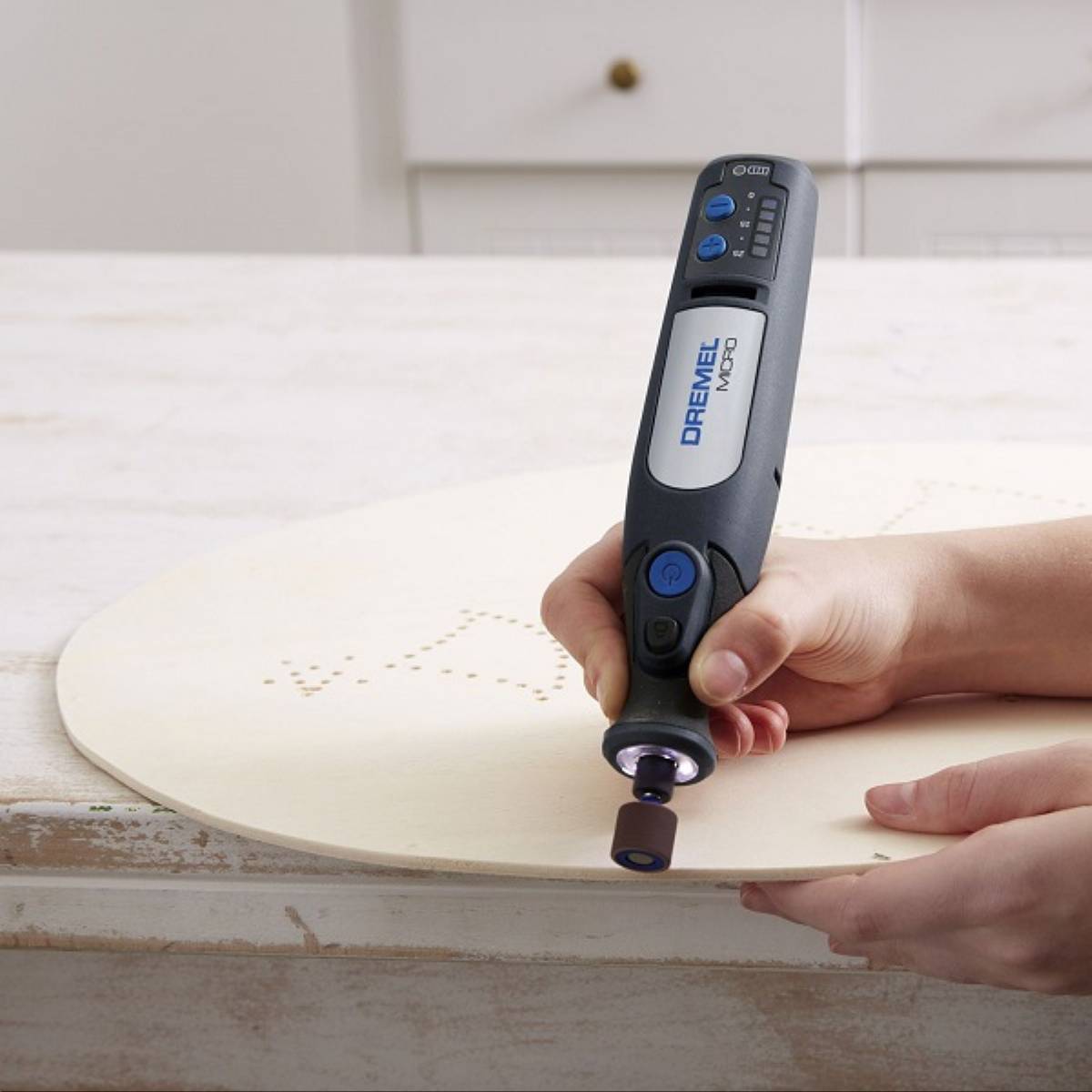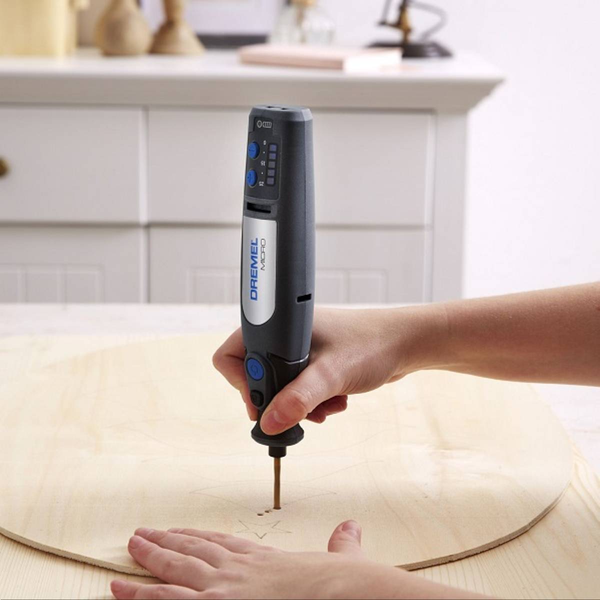 Następnie użyj narzędzia wielofunkcyjnego Dremel Micro i wiertła do drewna o średnicy 4 mm (636), aby po kolei wyciąć otwory układające się w kształt choinki. Są to miejsca, w których później zostaną umieszczone diody LED. Trzymaj narzędzie wielofunkcyjne pod odpowiednim kątem i upewnij się, że otwory znajdują się w odległości co najmniej 1 cm od siebie.