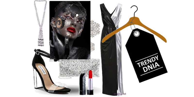 Pierwsza Inspirantka zdecydowała się na ciekawy model sięgający ziemi. Czarno-srebrna suknia z połyskującego materiału wzdłuż dosłownie dzieli się na pół, co podkreśla jeszcze kopertowe przewiązanie w talii. A do tego nic lepiej nie pasuje niż piękna bogato zdobiona srebrna biżuteria i mieniąca się brylancikami torebka oraz eleganckie szpilki z modnymi przezroczystymi motywami.