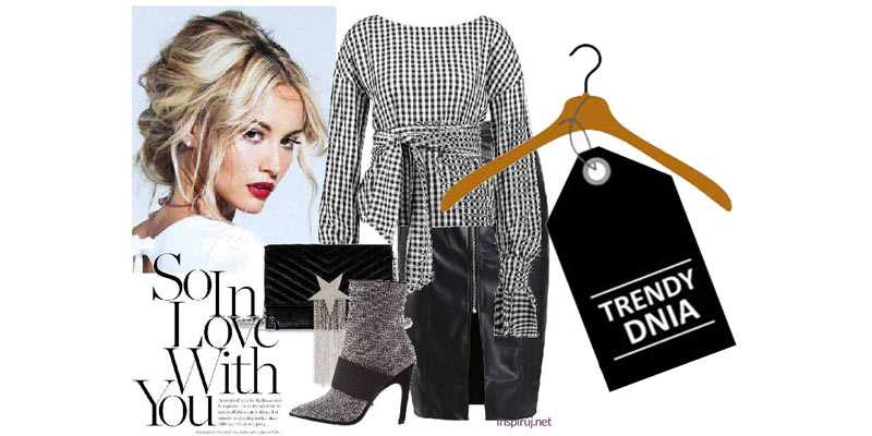 Kokarda na modnej koszuli w kratę w zestawieniu skórzanej ołówkowej spódnicy to zestaw niezwykle trendy. Każda z tych rzeczy bowiem wskazuje na jeden z modowych wyznaczników wiosenno-letniego sezonu. Nasza kokarda, której poświęcone są dzisiejsze Trendy Dnia pełni tu jednak wiele funkcji, a jedną z nich jest piękne podkreślenie talii. Przewiązanie jej w tym miejscu wyszczupli ją i uwydatni biust. Do tego aksamitna torebka w stylu glamour z ciekawą gwiazdką i botki na szpilce – pięknie korespondujące z koszulą.